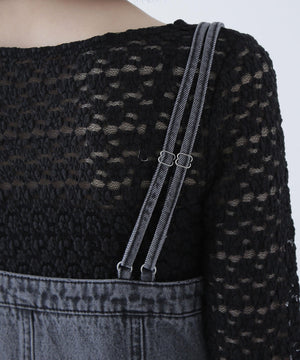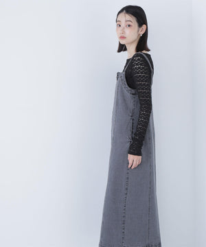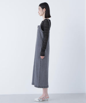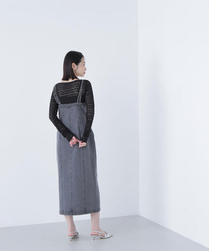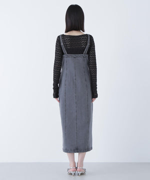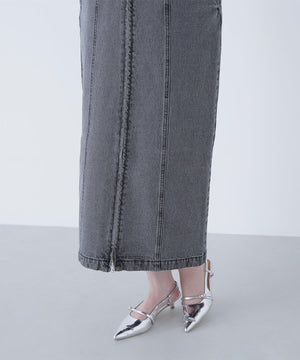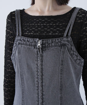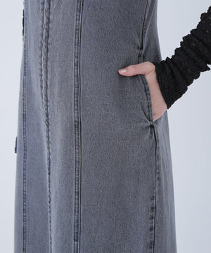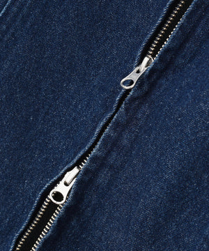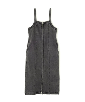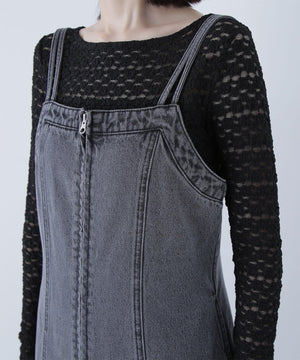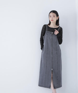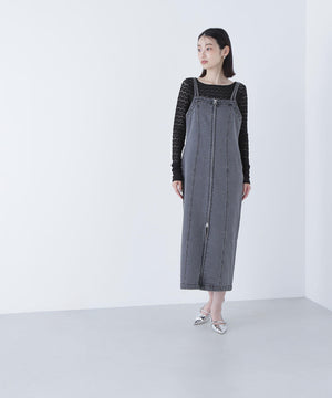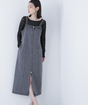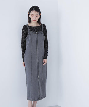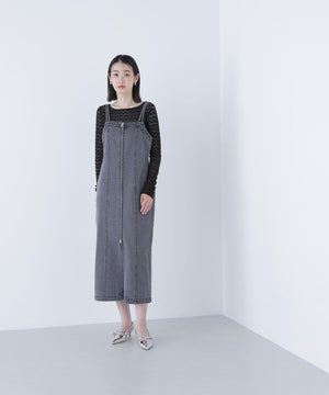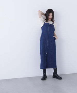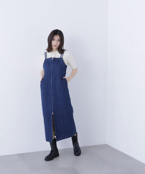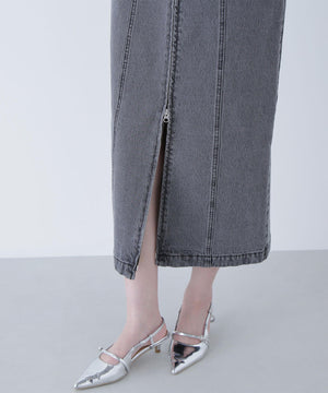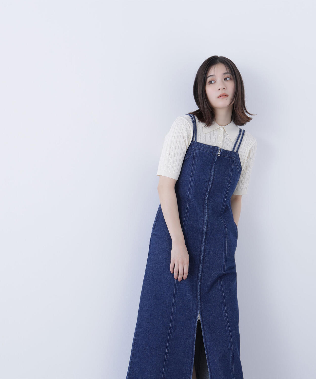 ナローなシルエットあがらウエスト回りが華奢にみえるシルエットのためスタイルよく見えます。ダブルストラップがポイントで肩紐調節可能。前ファスナーもダブルジップのため、お好きなスリット丈にできます。