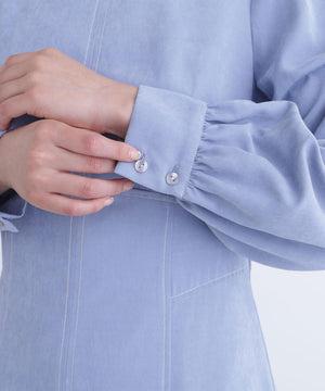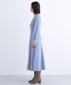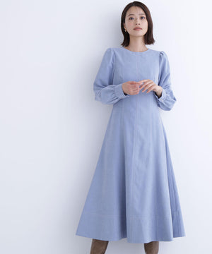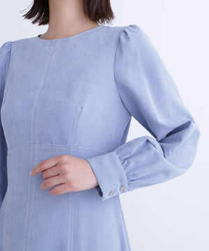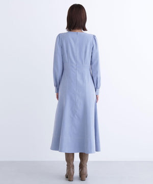 ピーチタッチの秋らしい素材を使用したキレイめワンピース。配色ステッチをさり気ないアクセントに、縦の切り替えラインも入っていてすっきりとした印象です。ウエスト切り替え位置を高くすることによって脚長効果も期待できます。きちんと感のあるクルーネックは、オフィスシーンにもちょっとしたお出かけにも合うデザインです。