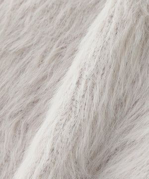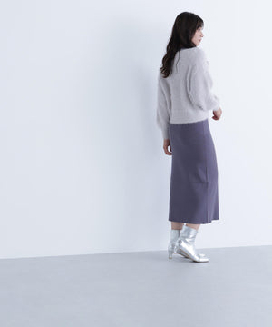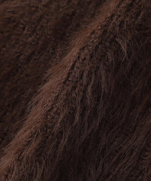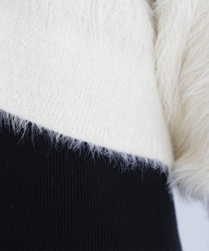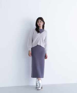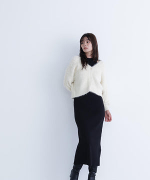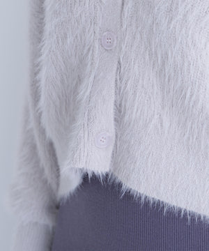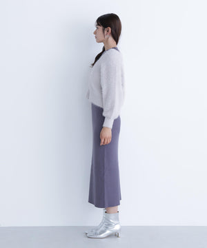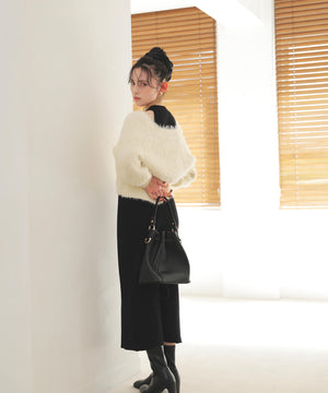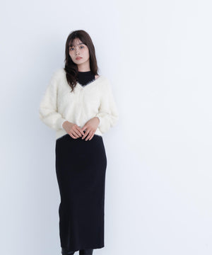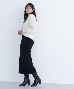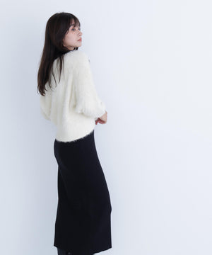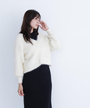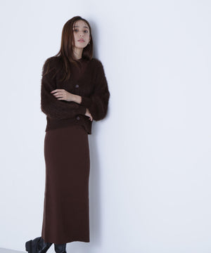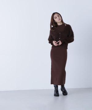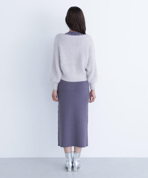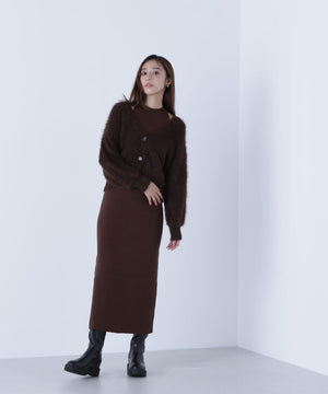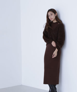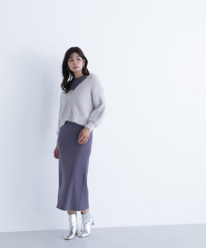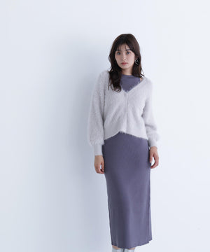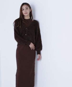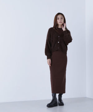 カーディガンは毛足のあるシャギー素材、ワンピースはすっきりとしたリブニットを使用しています。