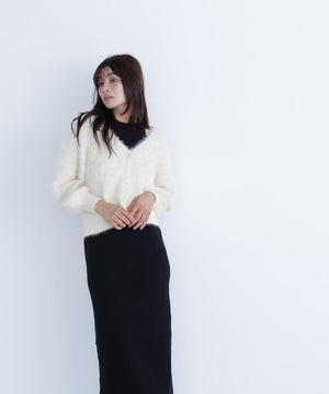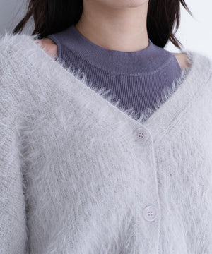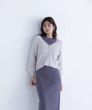 アメリカンスリーブのリブニットワンピースと、ゆるっとしたシャギーカーディガンがSETになったアイテム。ざっくりとしたシャギーカーディガンは、後ろに抜け感を出せるサイズ感です。2点セットで抜け感のある肌見せが叶うレイヤードデザイン。それぞれ単品使いもできるのでコーディネートの幅が広がります。