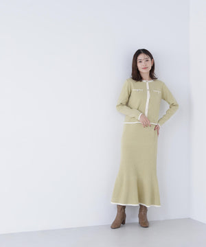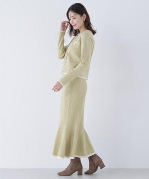 バイカラーの配色が目を引くニットカーディガンとスカートのセットアップ。カーディガンはコンパクトなシルエットで、羽織りにもプルオーバー風にも着ることができ、単品でも使いやすいデザインです。スカートはニットならではの程よいフィット感で、女性らしいシルエットを演出。上品な印象なのでお仕事シーンにもおすすめです。