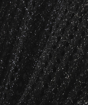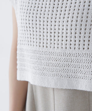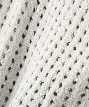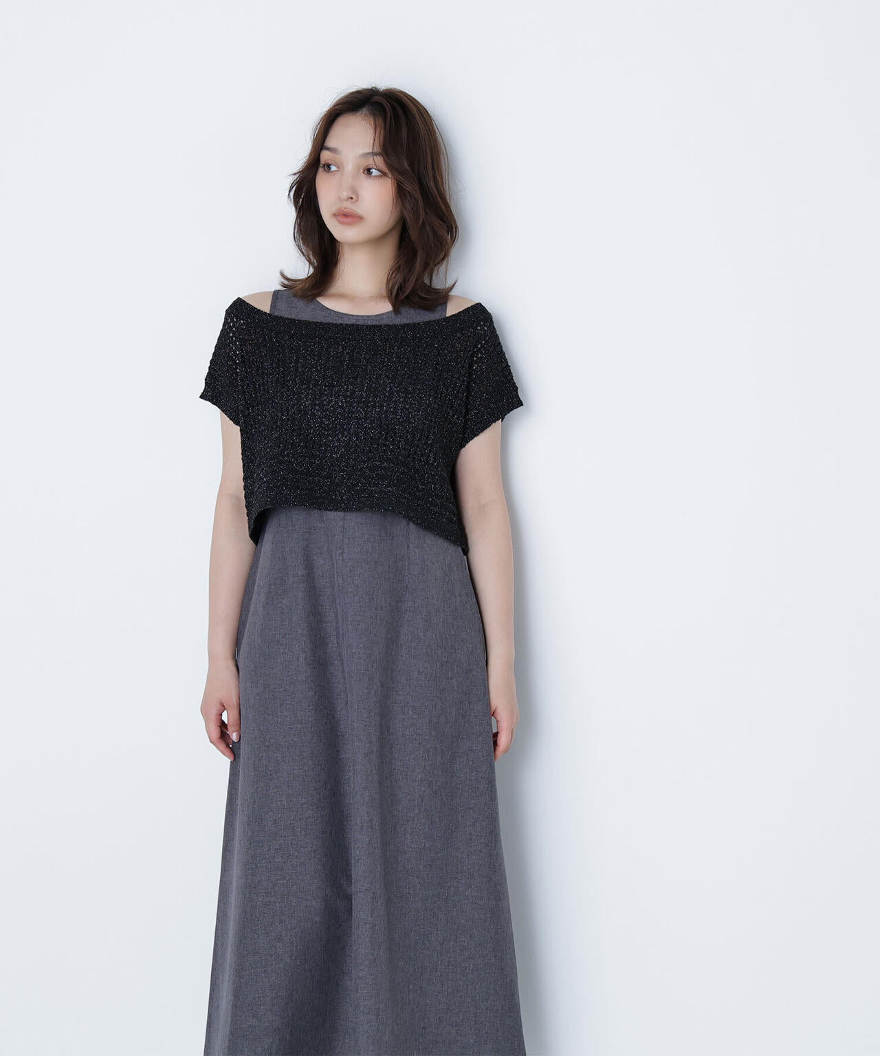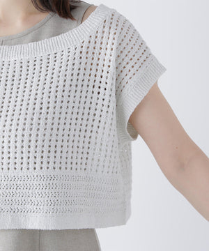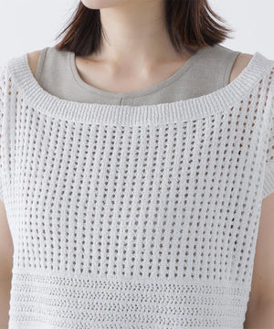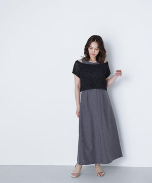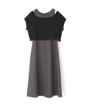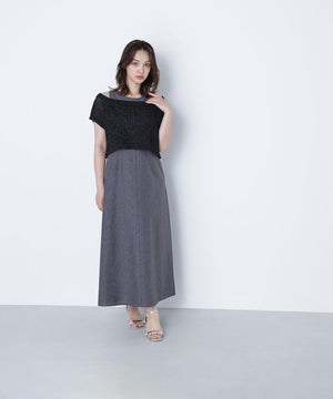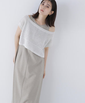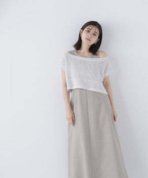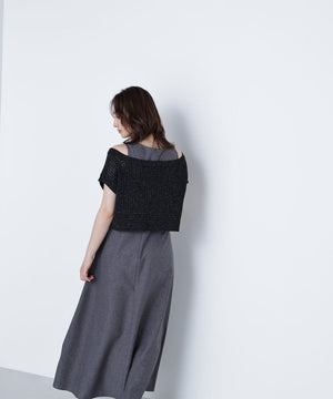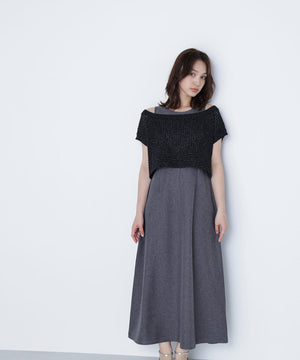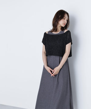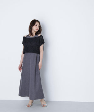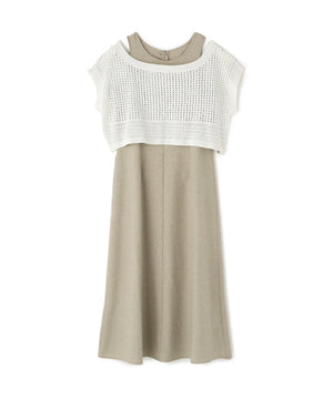 ワンピースは麻調のメランジ感がしっかりあるドライタッチな素材。ニットは細かなループ糸とラメ糸を合わせてメッシュ柄編みした編地です。