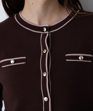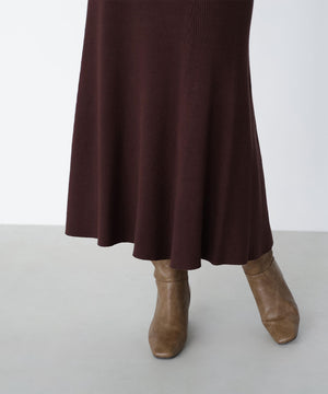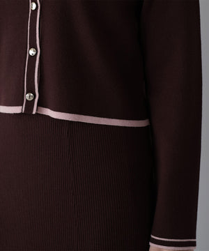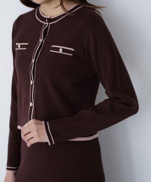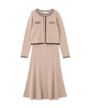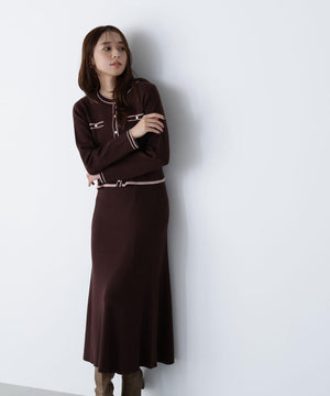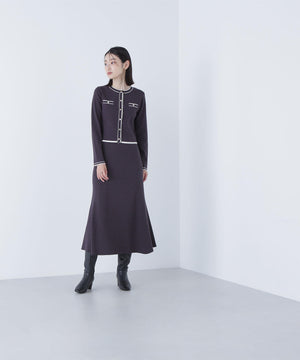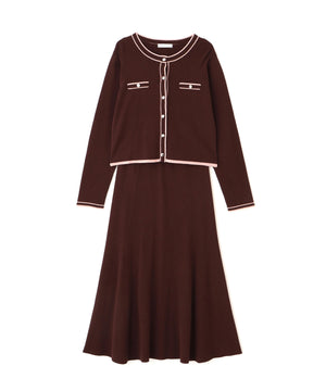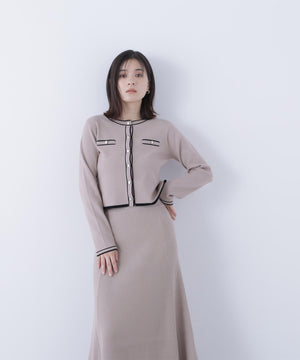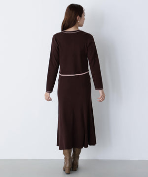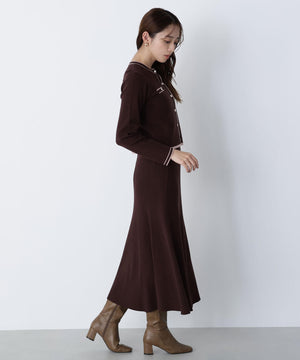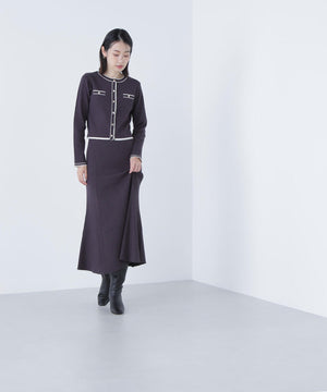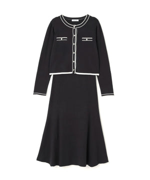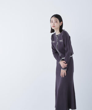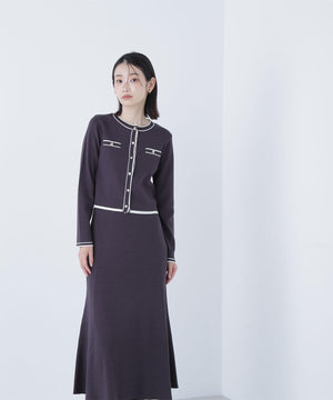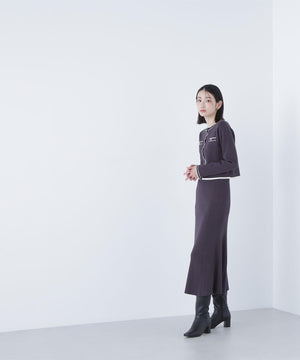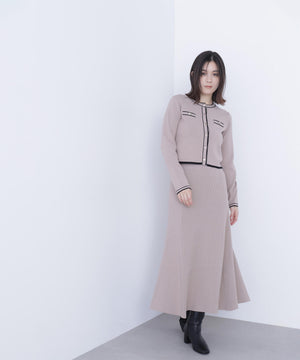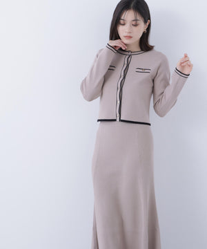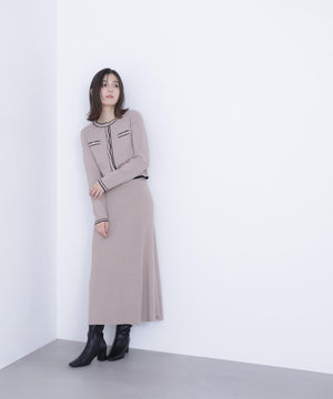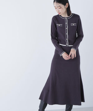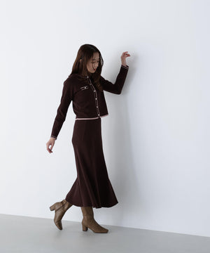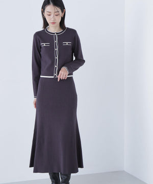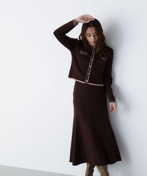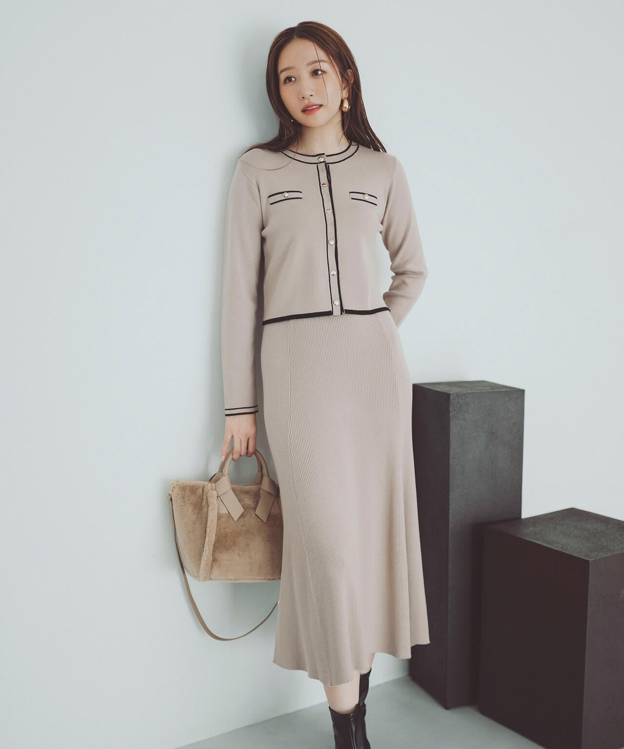 バイカラーの配色が効いたニットカーディガンとフレアスカートのセットアイテム。ニットカーディガンはきらっと光るゴールドカラー釦をアクセントに、細めのダブルラインのバイカラーを効かせて、華奢で上品な印象に。スカートは体のラインを拾いにくいリブ編みにし、裾に向かって広がるフレアシルエットに拘ったデザイン。ウエストはぐるりゴム仕様でストレスフリーな着心地です。