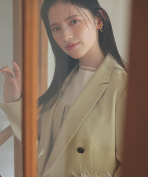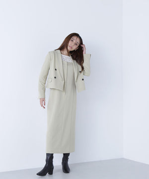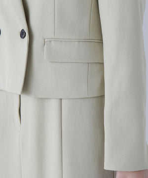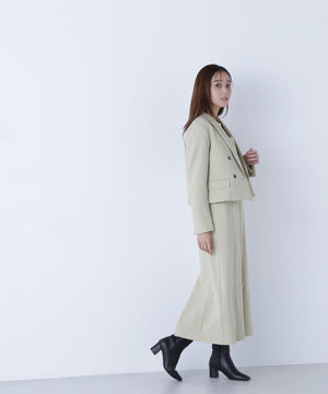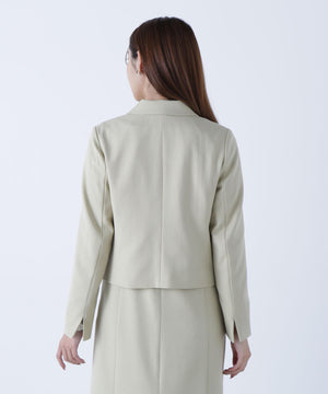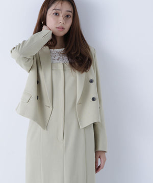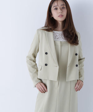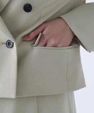 同素材のショートジャケットとセットアップスタイルが叶うショートジャケット。セットアップでも単品使いもできる着回し力が高いデザインは、ONにもOFFスタイルにも活躍します。こちらのコンパクト丈のテーラードジャケットは、配色が効いたマーブルのダブル釦が上品なアクセント。袖口はスリット入りです。