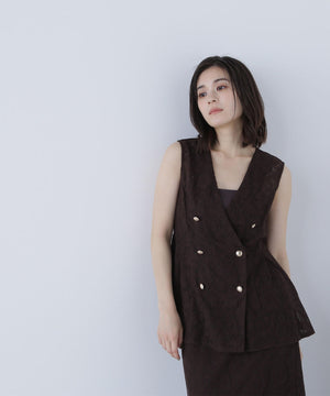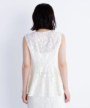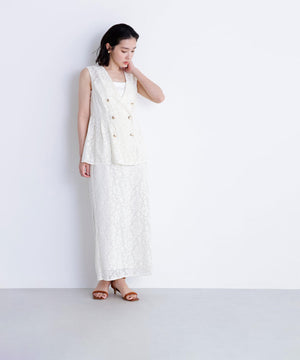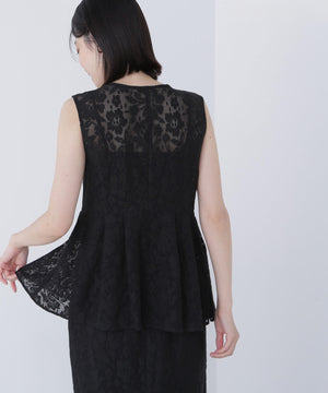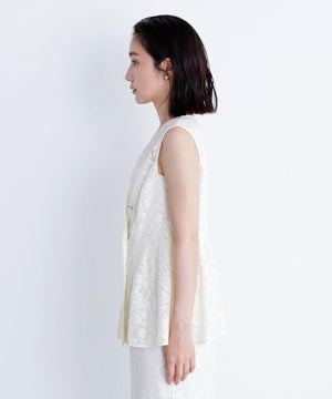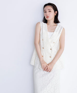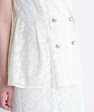 昨年も人気だったレース素材のジレセットアップが登場!今年はよりメッシュレースのフラワー感にフェミニンな柄を使用しています。ウエストに切替を入れることでシルエットを細く見せながら、タックによるフレアラインが上品なペプラムシルエットを演出。同素材のナロースカートを合わせたり、単品使いでデニムを合わせたカジュアルダウンもおすすめです。