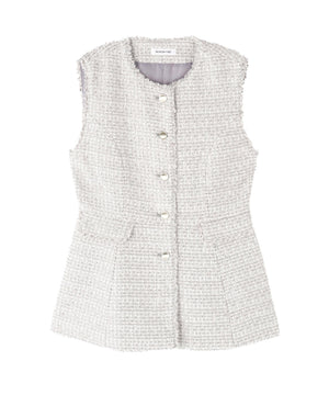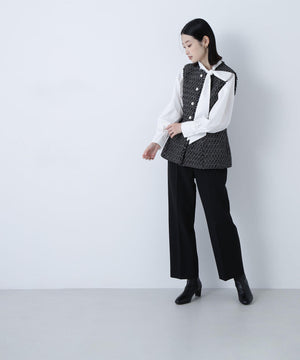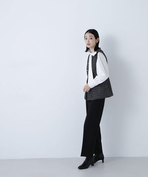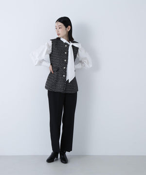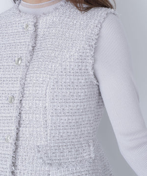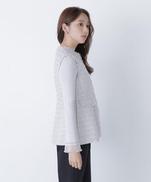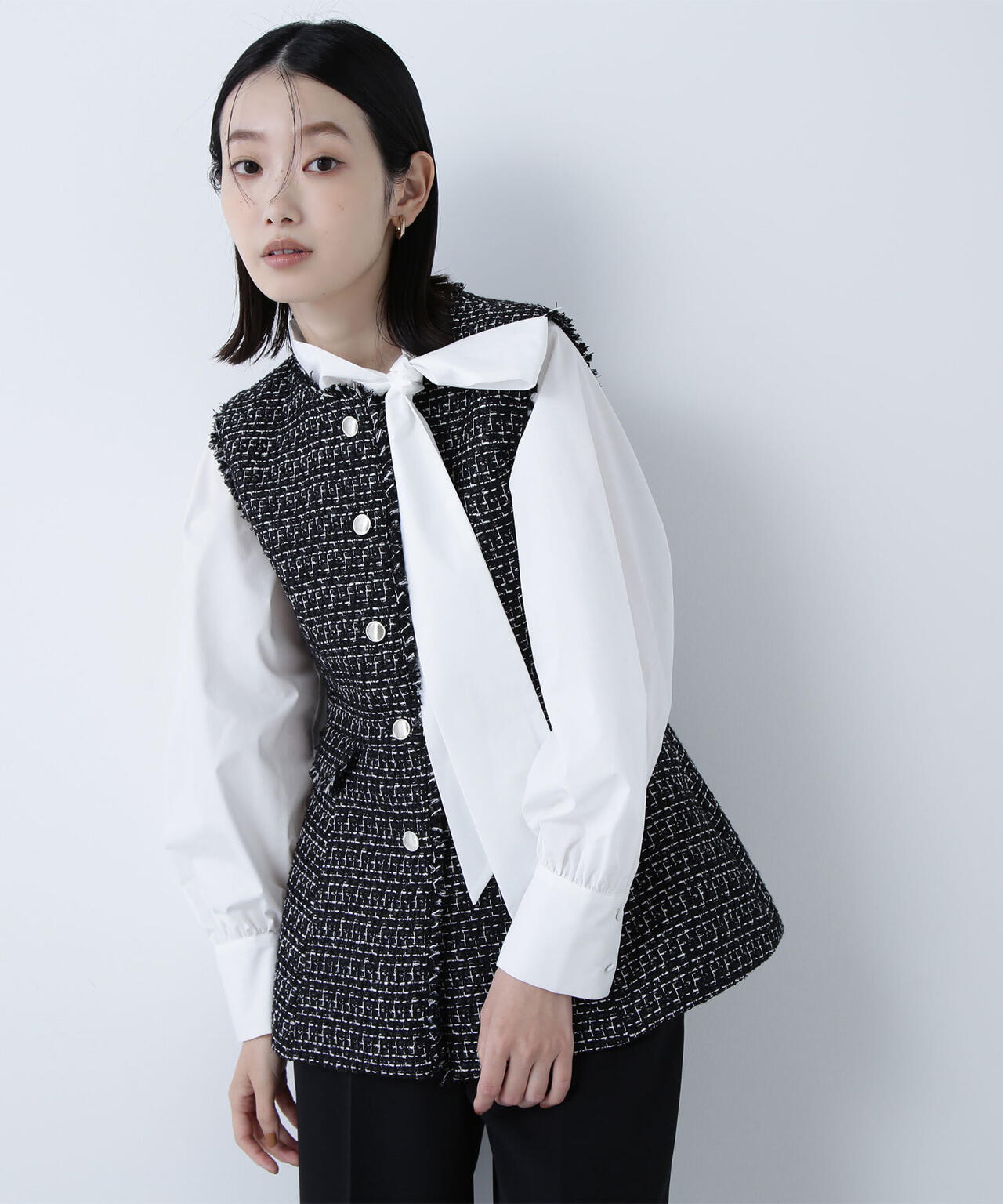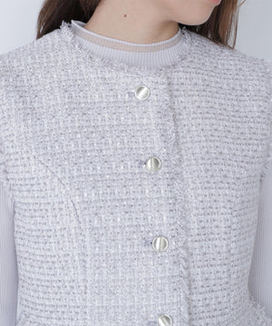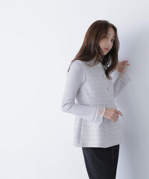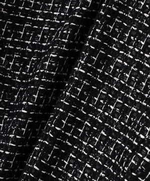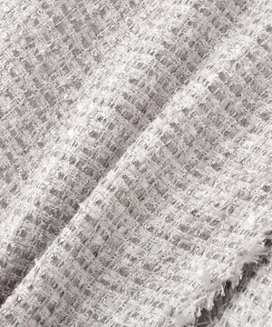 ファンシーヤーンやラメ糸を組み合わせた上品な雰囲気のオリジナルツイード素材を使用。オケージョンシーンからカジュアルMIXスタイルまで合わせやすい素材感です。