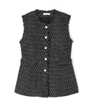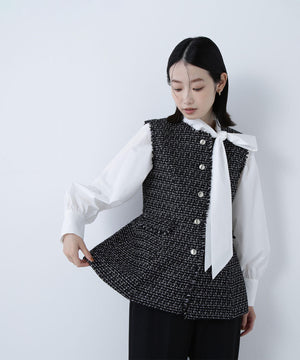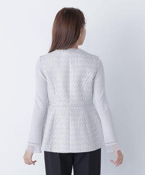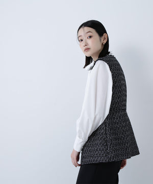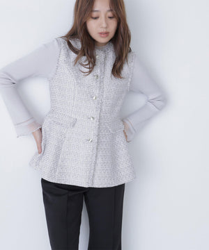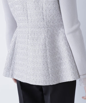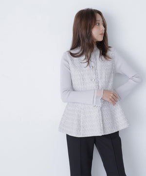 NBBオリジナルのツイード素材を使用したペプラムジレ。ラメ糸を組み合わせているのできらっとした光沢が、コーディネートを華やかに見せてくれます。ゴールドカラーの釦もアクセント。腰まわりをカバーしながら、キレイなペプラムシルエットを作るデザインで、スタイルアップ効果も期待できます。糸色から配色に拘ったベーシックに着回せるブラック系と、ニュアンス感が大人の可愛さを引き立てるグレー系の2色展開です。