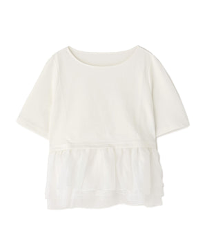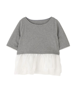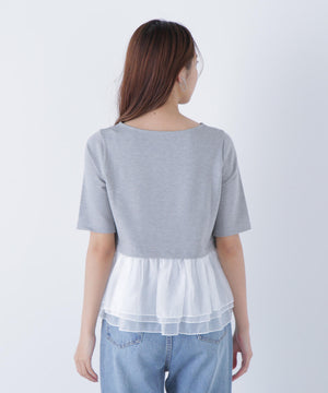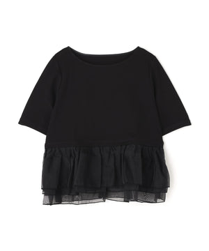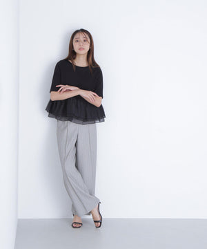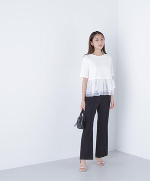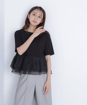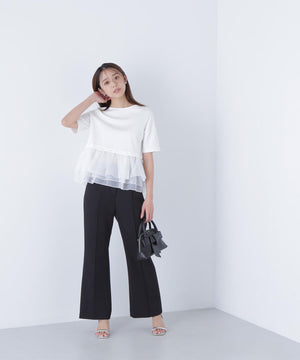 しっかりしたキレイ目な表面感のカットソーと裾にシフォンをドッキングしたトップス。ペプラム切り替えがウエストラインを高く見せ、スタイルアップを期待できます。1枚で様になるデザインながら、カットソーなので軽い着心地です。