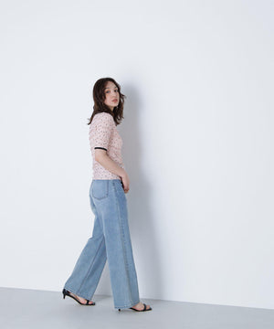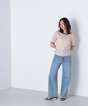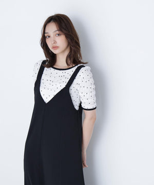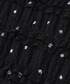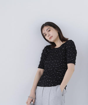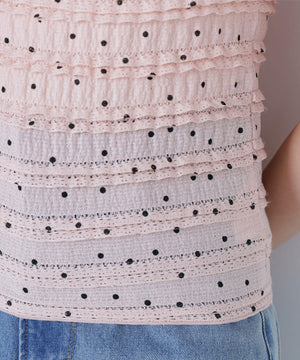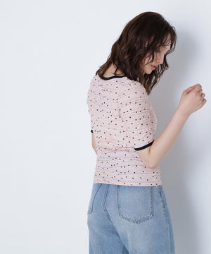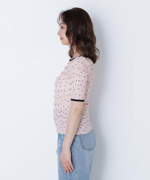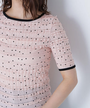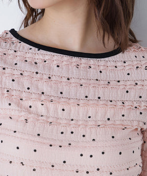 フリルとドットプリントが入っているフェミニンな生地を使用したトップス。カットソーなので着心地が良く、デイリー使いできる扱いやすさも嬉しい。コンパクトなシルエットながらフィットしすぎず、ベーシックなサイズ感が、着回せるデザインです。