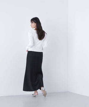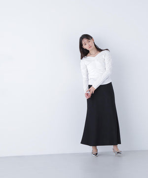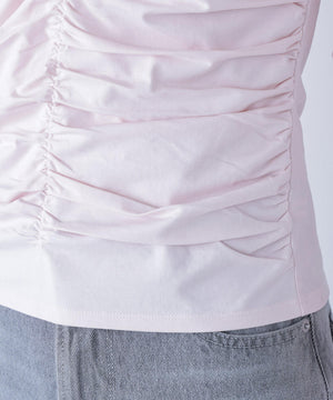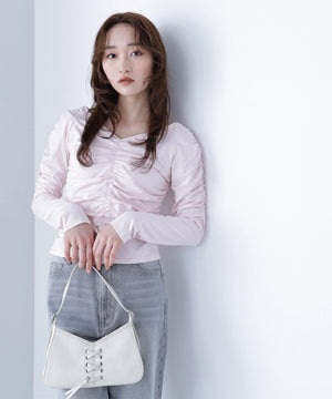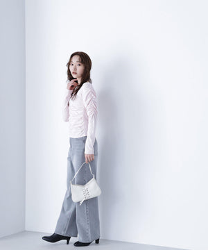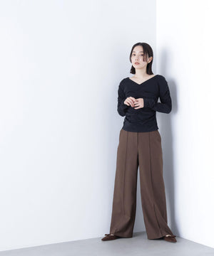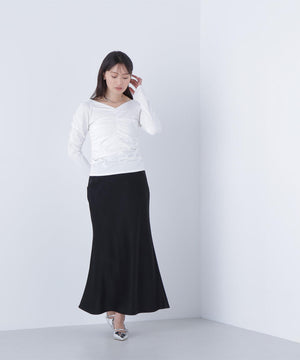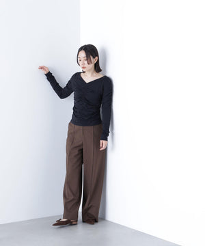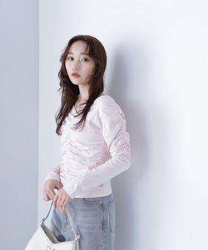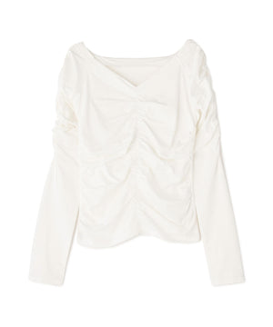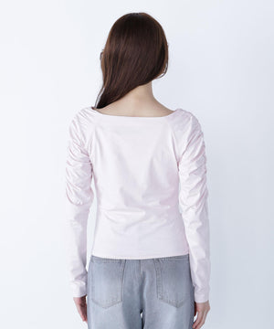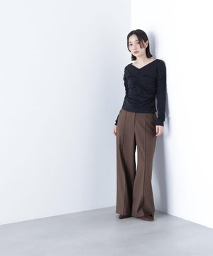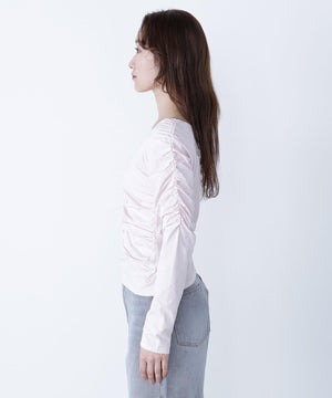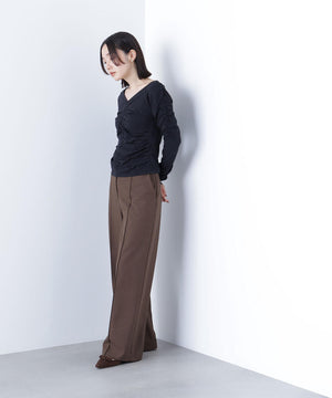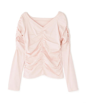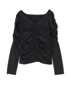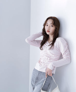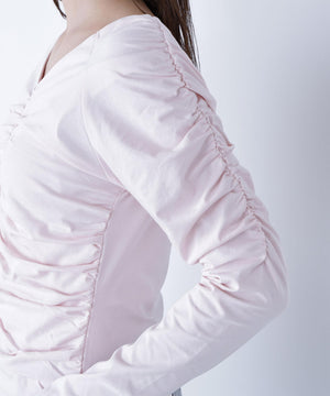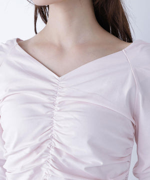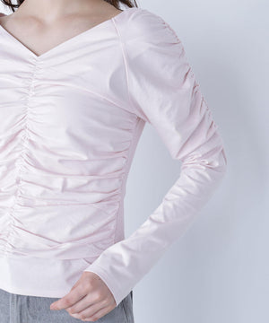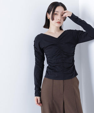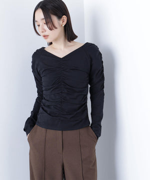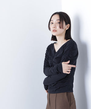 袖と身頃にギャザーをふんだんに入れたトレンド感のあるカットソートップス。体にフィットするシルエットながら、窮屈に感じさせない着心地です。ラグランに切り替えたVネックの襟ぐりが程よい抜け感を演出。ジャケットのインナーとしてポイントに効かせたり、1枚着でもギャザーのデザインが華やかに見せてくれます。