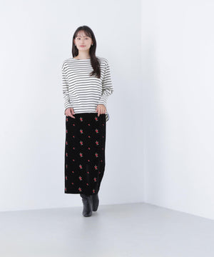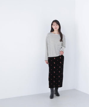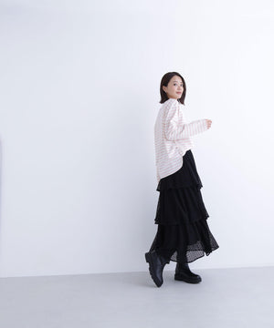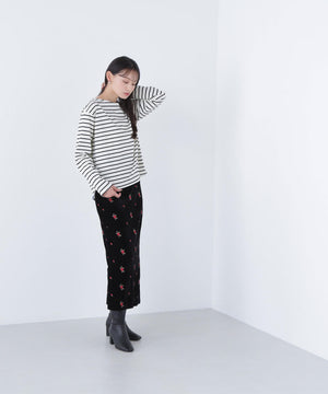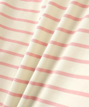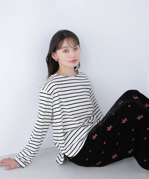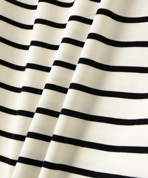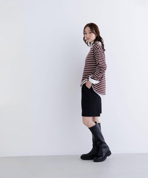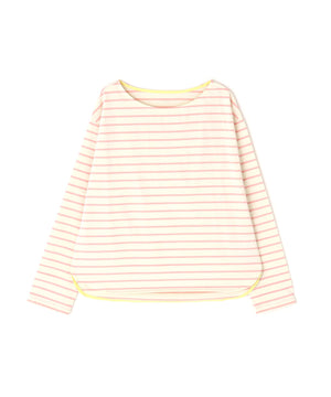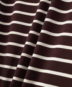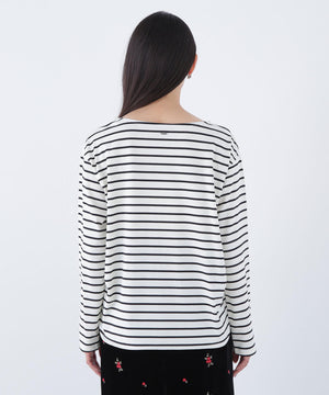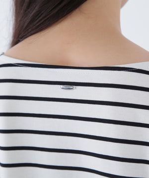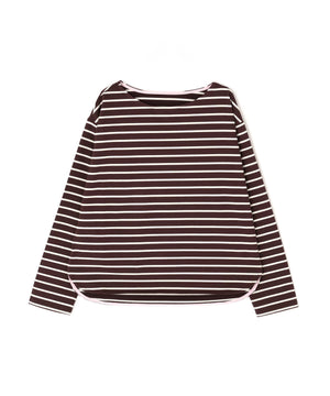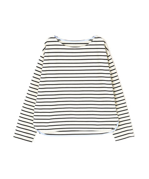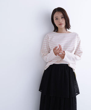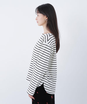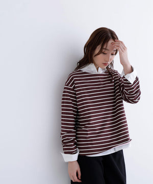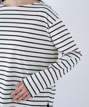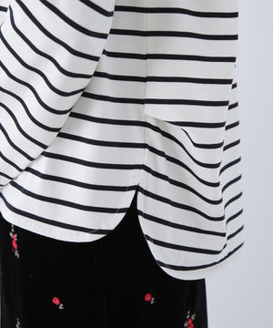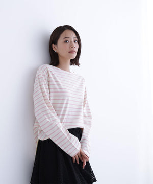1枚着でもレイヤードでも着回せるボーダーカットソー。内側で縁取りしているバインダーのカラー配色がさり気ないポイントです。後ろネックのゴールドカラーのプレート、サイドに入れたタックなど、カジュアルになりすぎず女性らしいディテールに仕上げたデザインです。