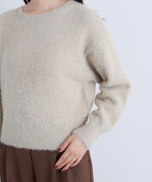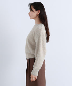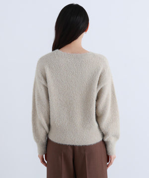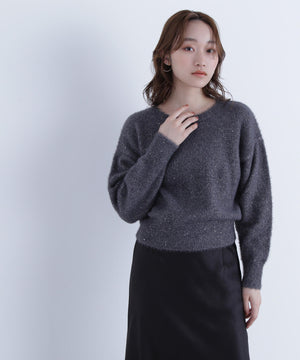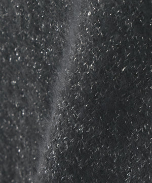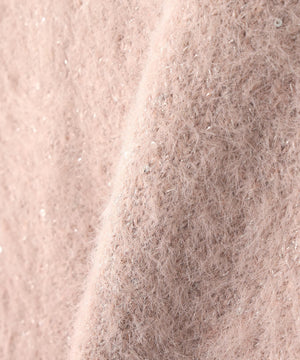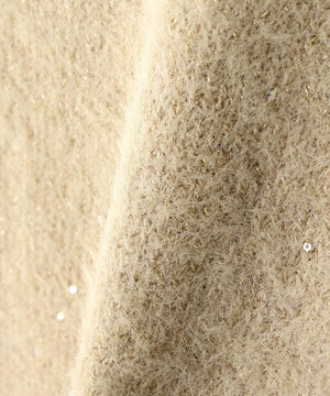 毛足のあるフェザーヤーンにスパンコール糸をミックスさせたきらめき感ある編地です。