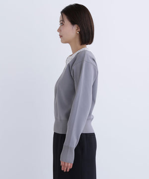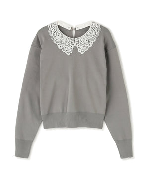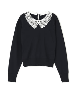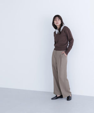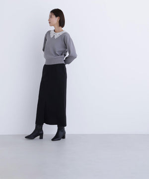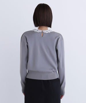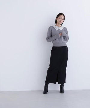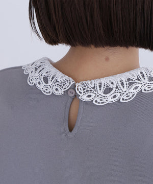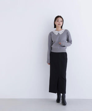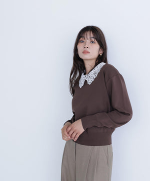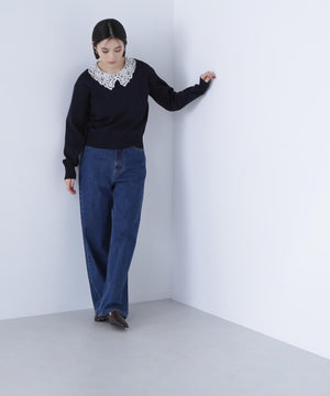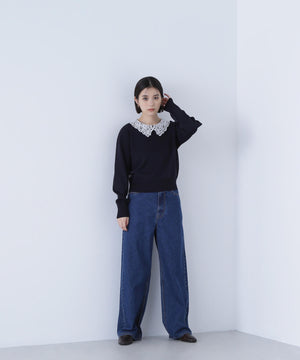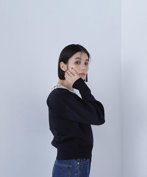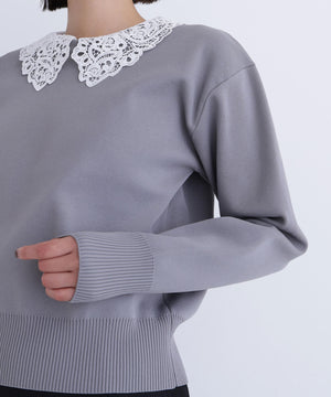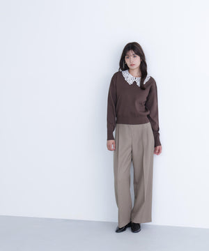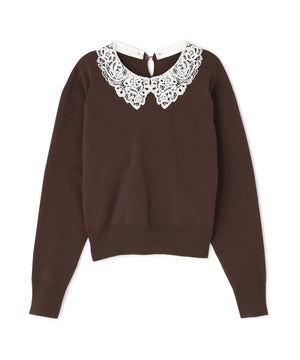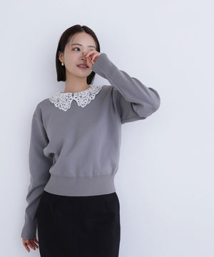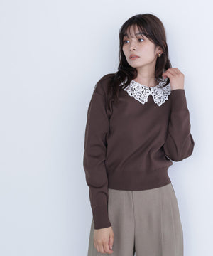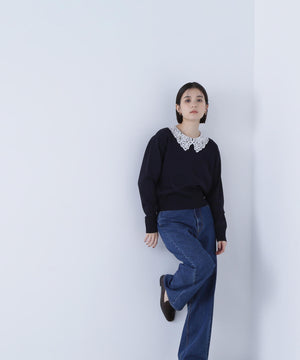 NBBオリジナルのレース柄の襟付きで、きちんと感と華やかさを叶えるニットプルオーバー。レース襟は内側の釦で取り外しできます。身頃はフォルム感のあるシルエットで、裾はブラウジングできるリブ編みのためアウトスタイルがおすすめ。ストレートパンツやフレアスカートも合わせやすく、幅広いコーディネートが楽しめます。