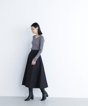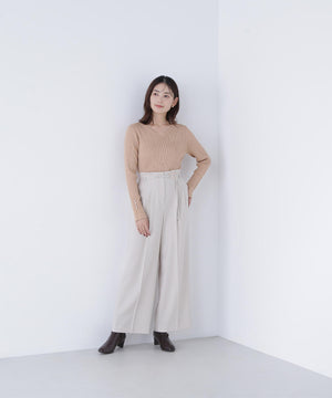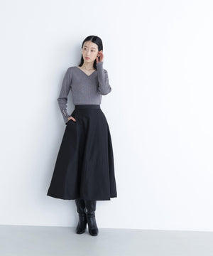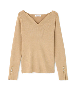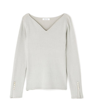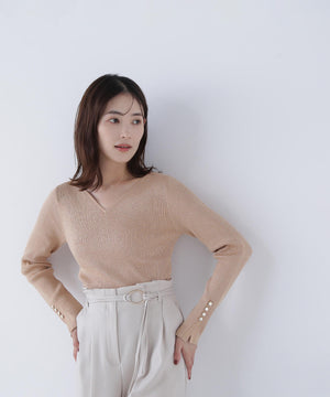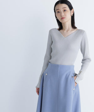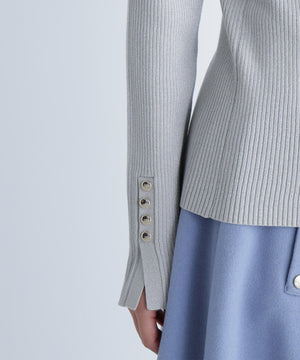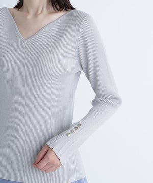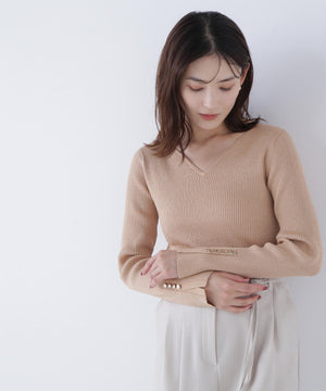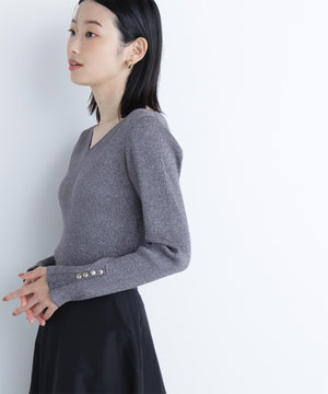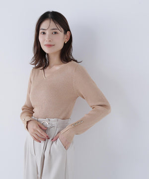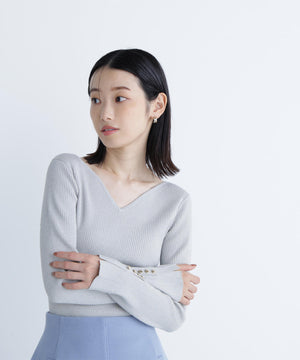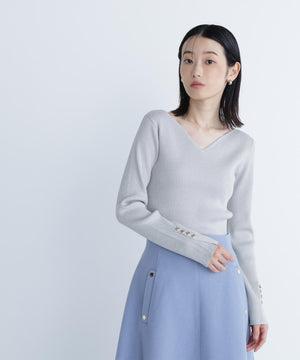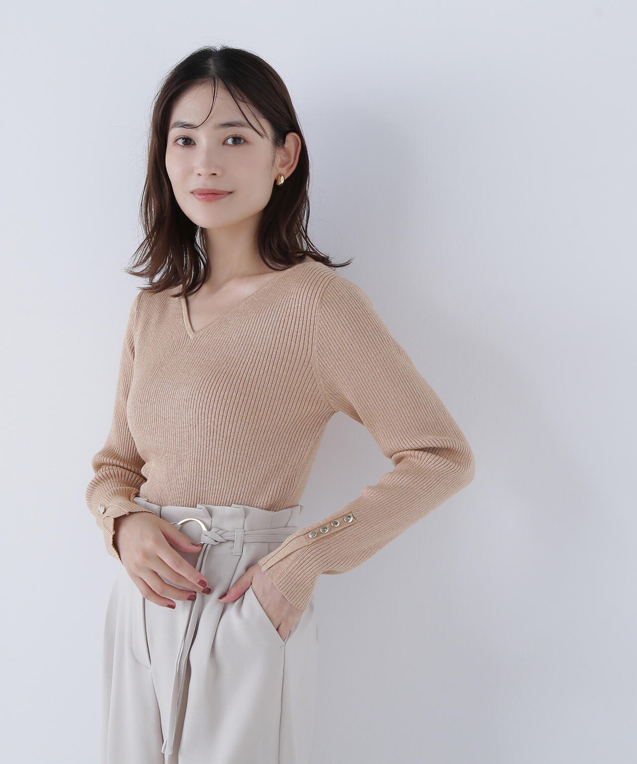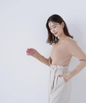 ニュアンスのあるネックデザインがさりげないおしゃれポイントのリブニット。ベーシックながらも上品な雰囲気で、幅広いスタイリングに合うデザインです。袖口のボタンがアクセントとなり、細部までこだわりを感じさせる一枚。ほどよいフィット感で女性らしいシルエットを演出します。デイリーからオフィスシーンまで、長いシーズン着ていただけます。