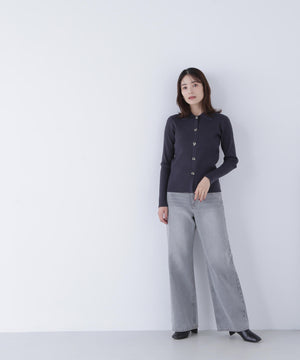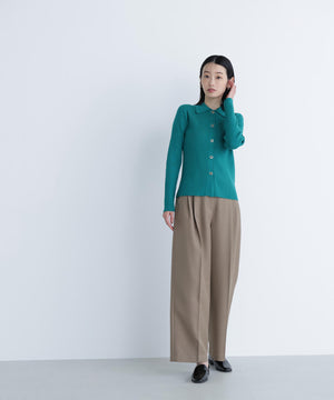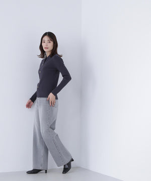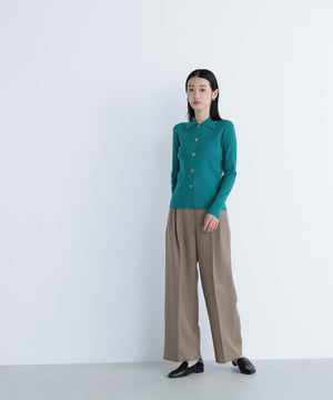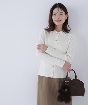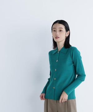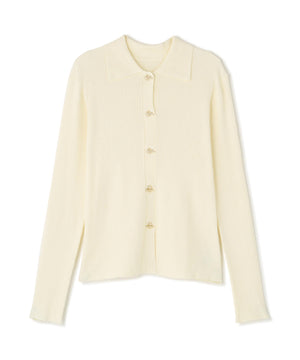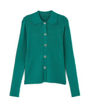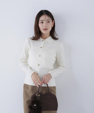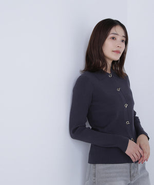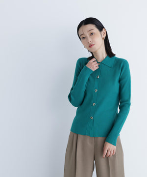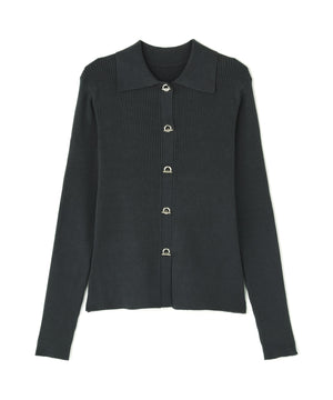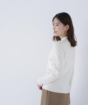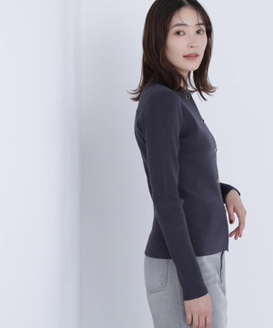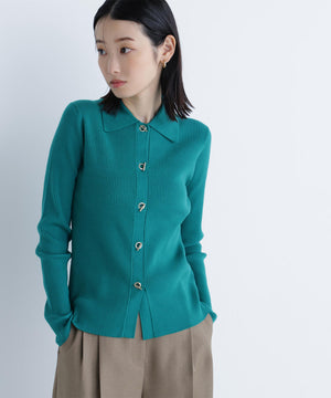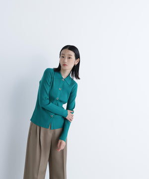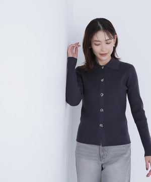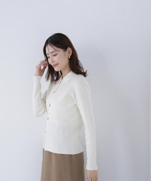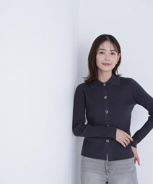 飾りのハトメボタンがポイントのポロカラーニット。ハトメボタンは上のみ開く仕様です。ベーシックなサイズ感ながら、伸縮性のあるリブ編みなので快適な着心地です。