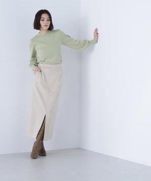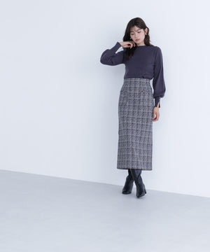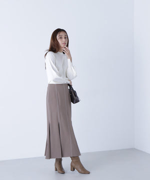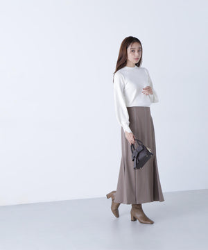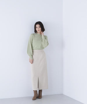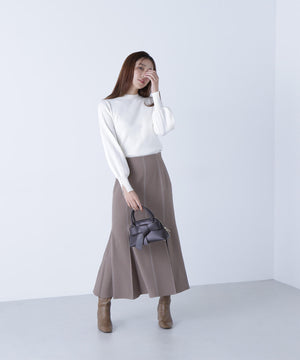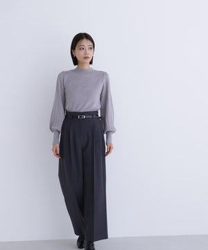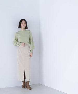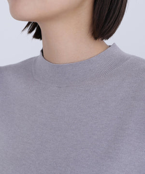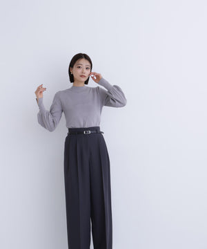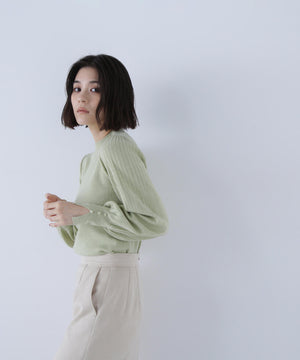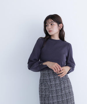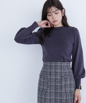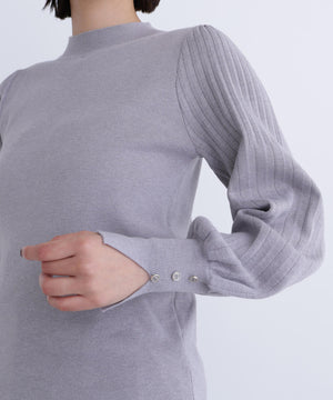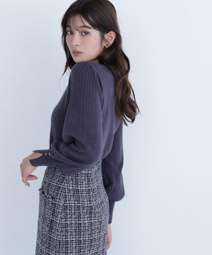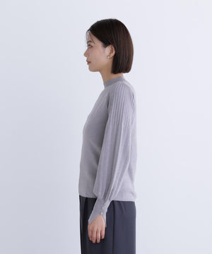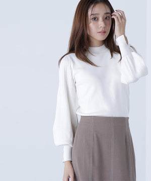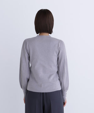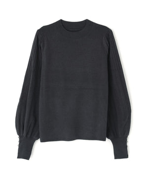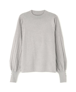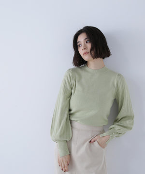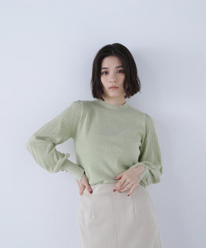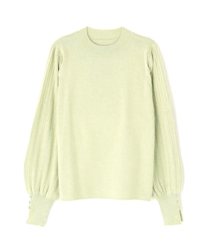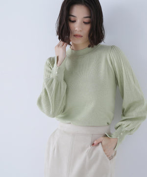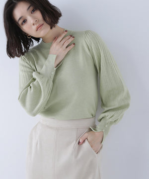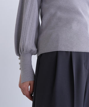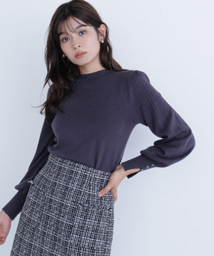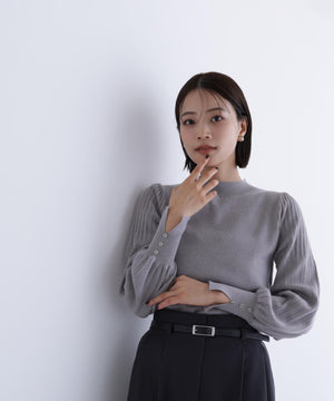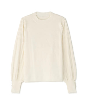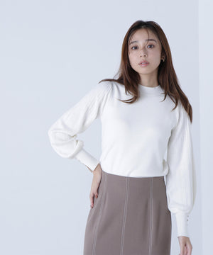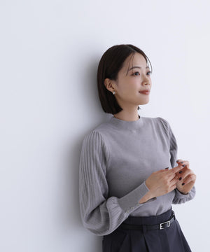 スリット入りの袖口に、ポイントとなるライトゴールドカラーの縁取りされた釦をあしらったニットプルオーバー。袖はプリーツ編みを2段階に切り替えて、すっきりとした印象ながら程よいボリューム感を出しています。モックネックの襟がキレイめな印象なので、ジャンスカやアウターのインナーにもぴったり。コンパクトなボディ感のため、ハイウエストのスカートやパンツとのコーディネートもバランス良く着ていただけます。