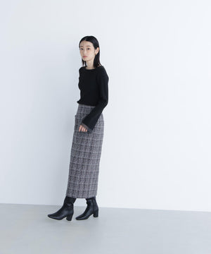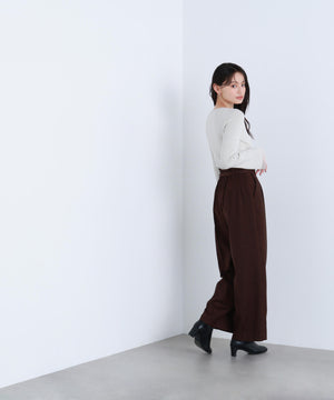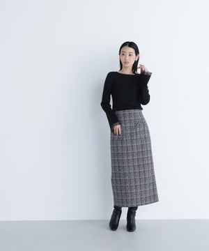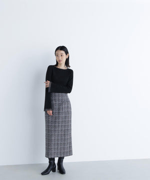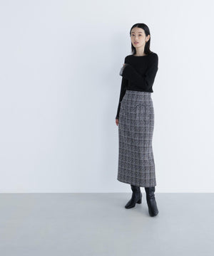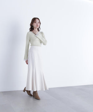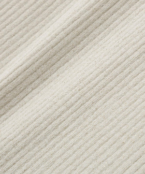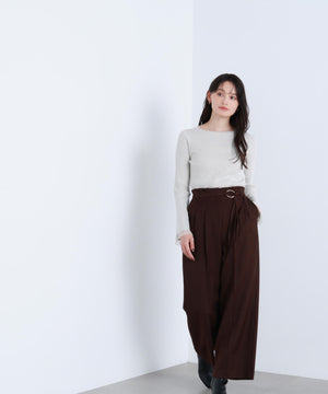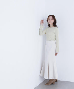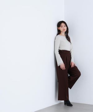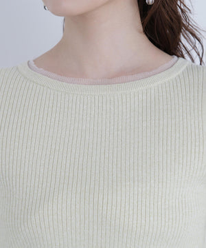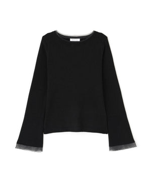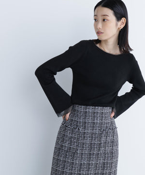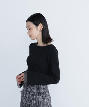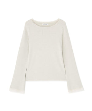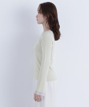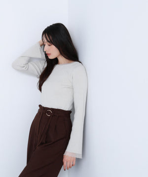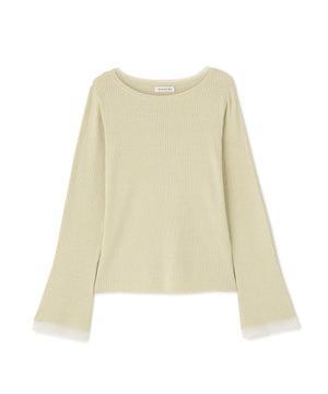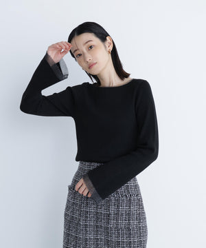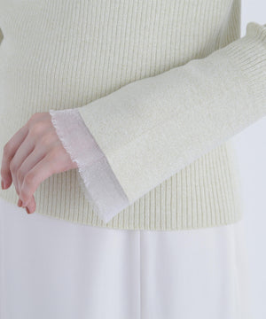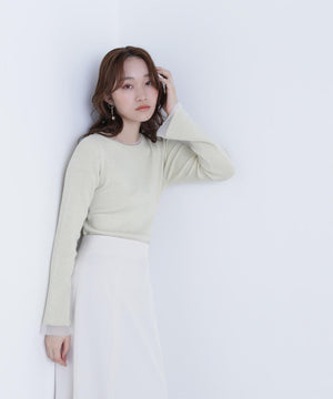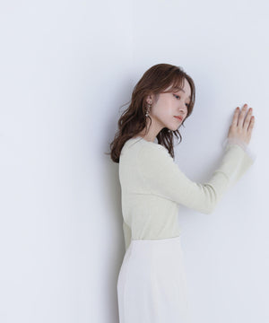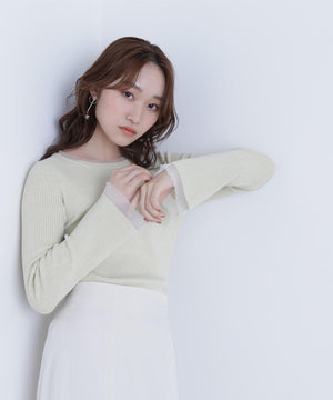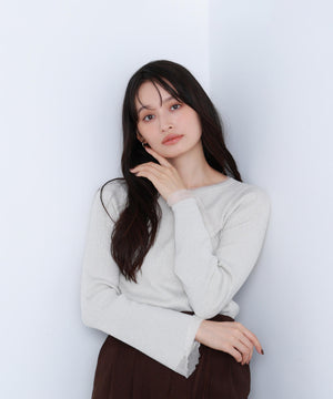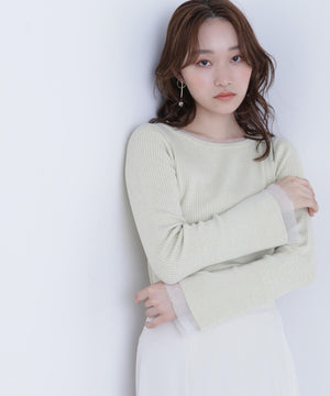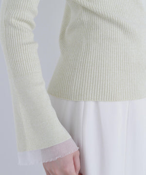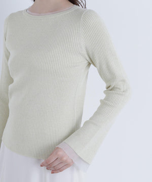 襟ぐりと袖口のシアー切り替えがポイントのリブニット。華奢でシアーなリブ編みを襟ぐりと袖口に入れることで、軽やかなアクセントになっています。袖口はフレアスリーブデザインで華やかに。身頃も繊細に光るラメ糸が入っているので、上品な雰囲気で着ていただけます。