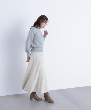 キラキラとしたシャギー糸が愛らしく、シーズンムードを引き立てるニットプルオーバー。襟ぐりはすっきりとしたボートネックデザインです。袖口はギャザーを寄せたパフスリーブで、袖口リブにはパール調ボタンを付けてフェミニンな印象をプラス。スカート合わせでレディライクに、パンツ合わせでオフィスカジュアルにも映える万能アイテムです。