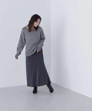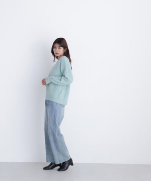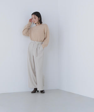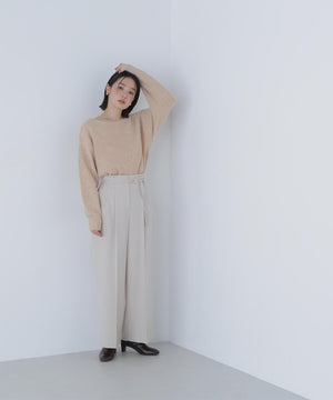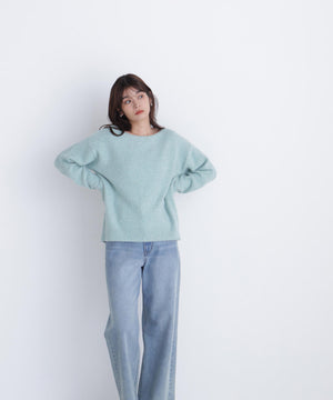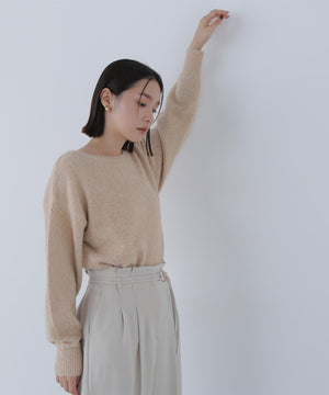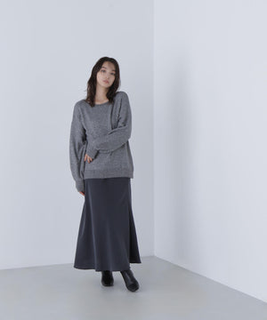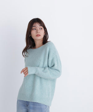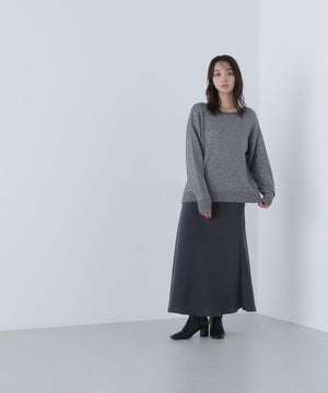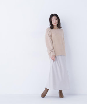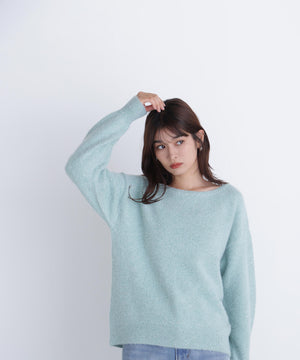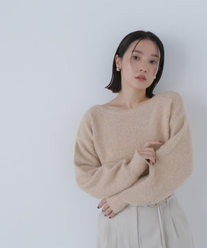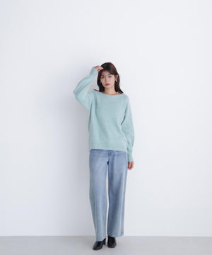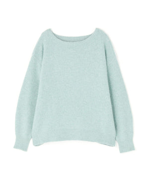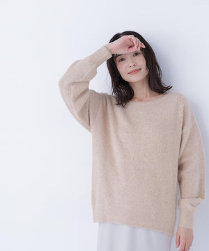 ふわふわのフェザーヤーンときらっと光るスパンコール糸を引き揃えたラメニットプルオーバー。襟は抜け感のあるボートネックで、身頃はゆるっとしたオーバーサイズのシルエットです。裾に前後差をつけているので、前裾インもしやすくなっています。華やかさとリラクシームードを両立したデザインは、デイリーからお出かけシーンまで着映えます。