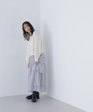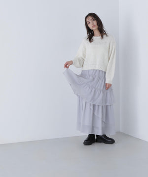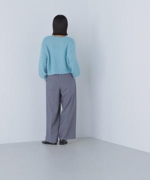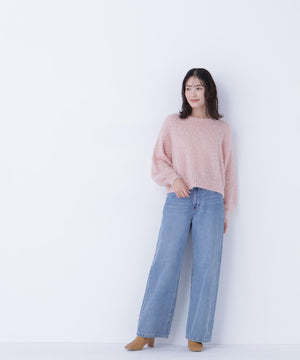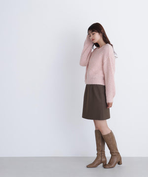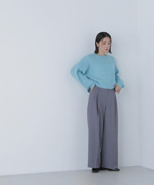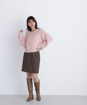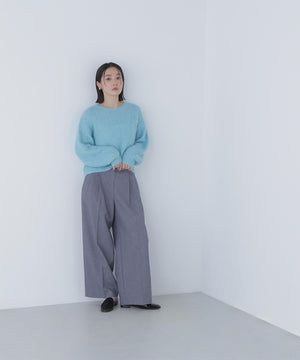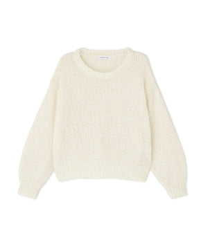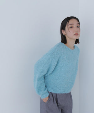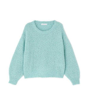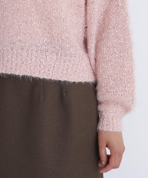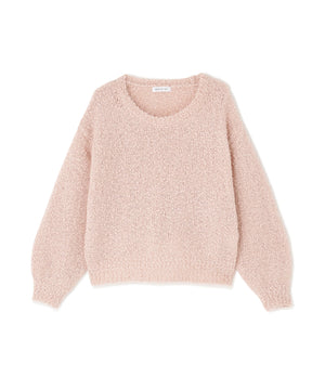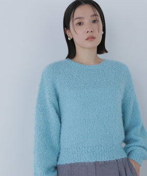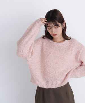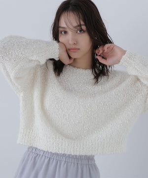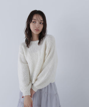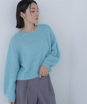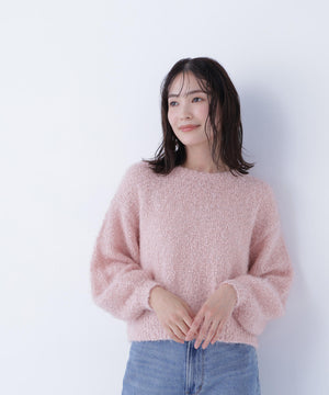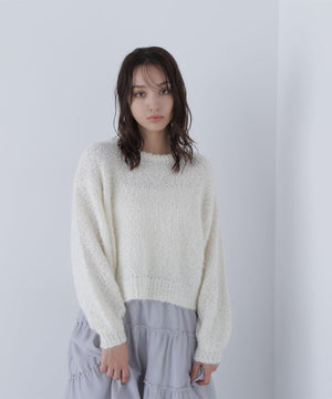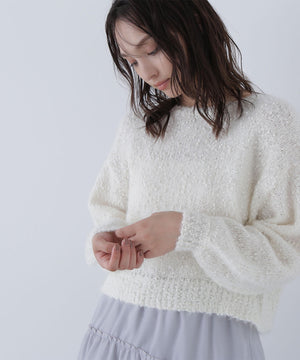 エアリー感のあるフェザーとネップヤーンを撚糸した表情豊かなニット。袖は少しぱふっとしたボリュームがあり、フェミニンな印象に見せてくれます。抜け感のある首元で女性らしさもプラス。ボトムスにインをしなくても決まる丈感なので、スタイリングを選ばずに着ていただけます。