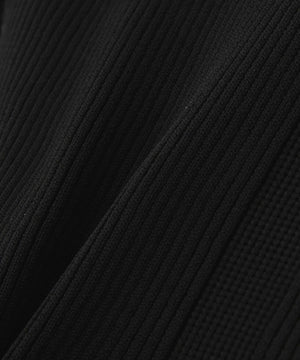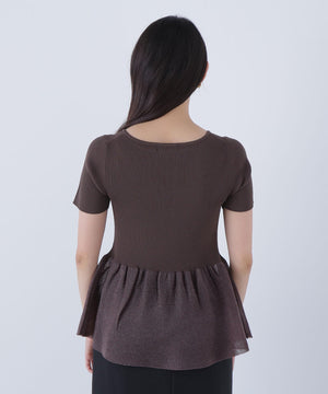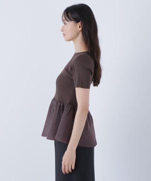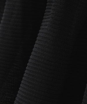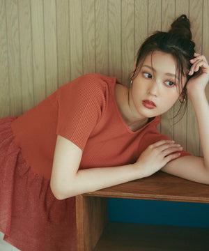 ボディは清涼感のあるタッチのポリエステル糸でリブ編みに編み立てています。ペプラム部分はクリアなシアー糸を使用しています。