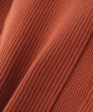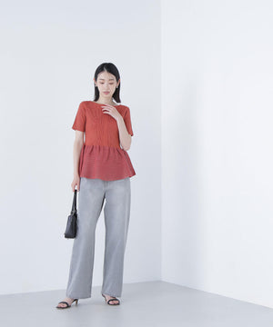 裾まわりのシアーペプラムデザインがポイントのニットプルオーバー。ボディ部分はリブ編みでフロントに編地のラインを入れることで、すっきりとしたシルエットを演出。ペプラム部分はシアーの糸を使用し、ボリューム感のあるペプラムシルエットに拘ったデザインです。ナロースカートや細身のパンツ合わせで、スタイリッシュなスタイリングがおすすめです。