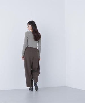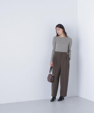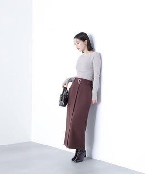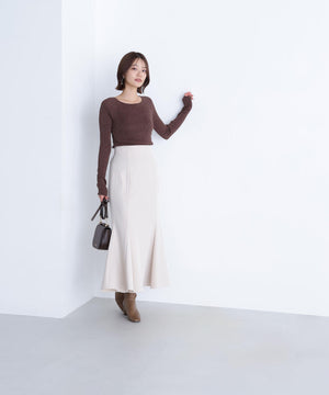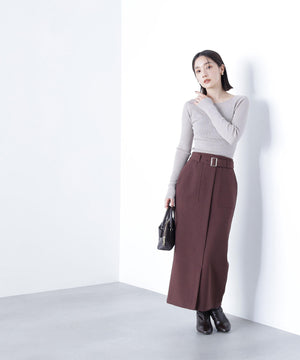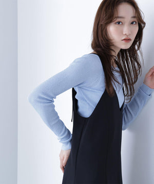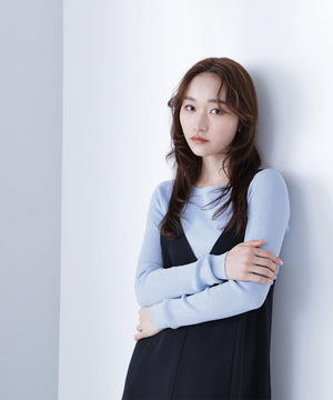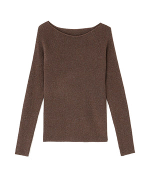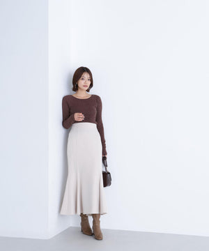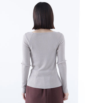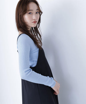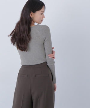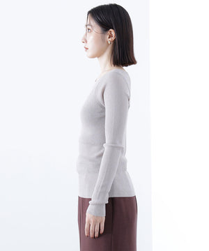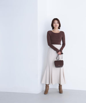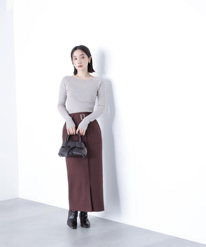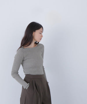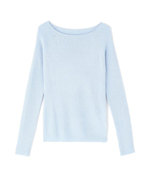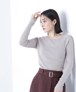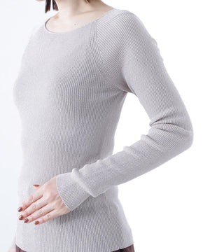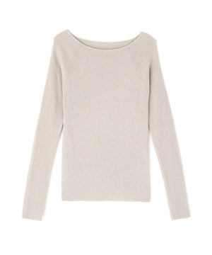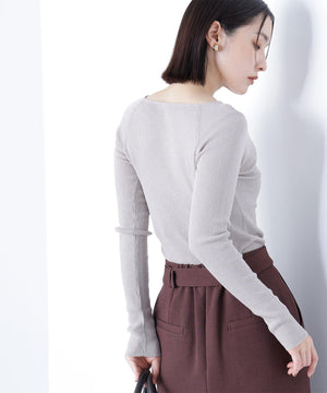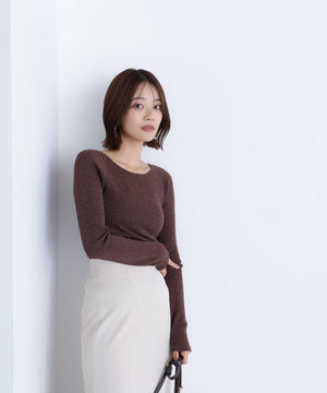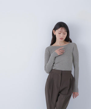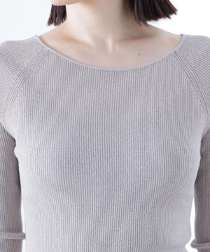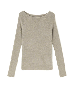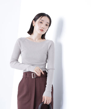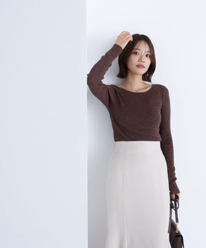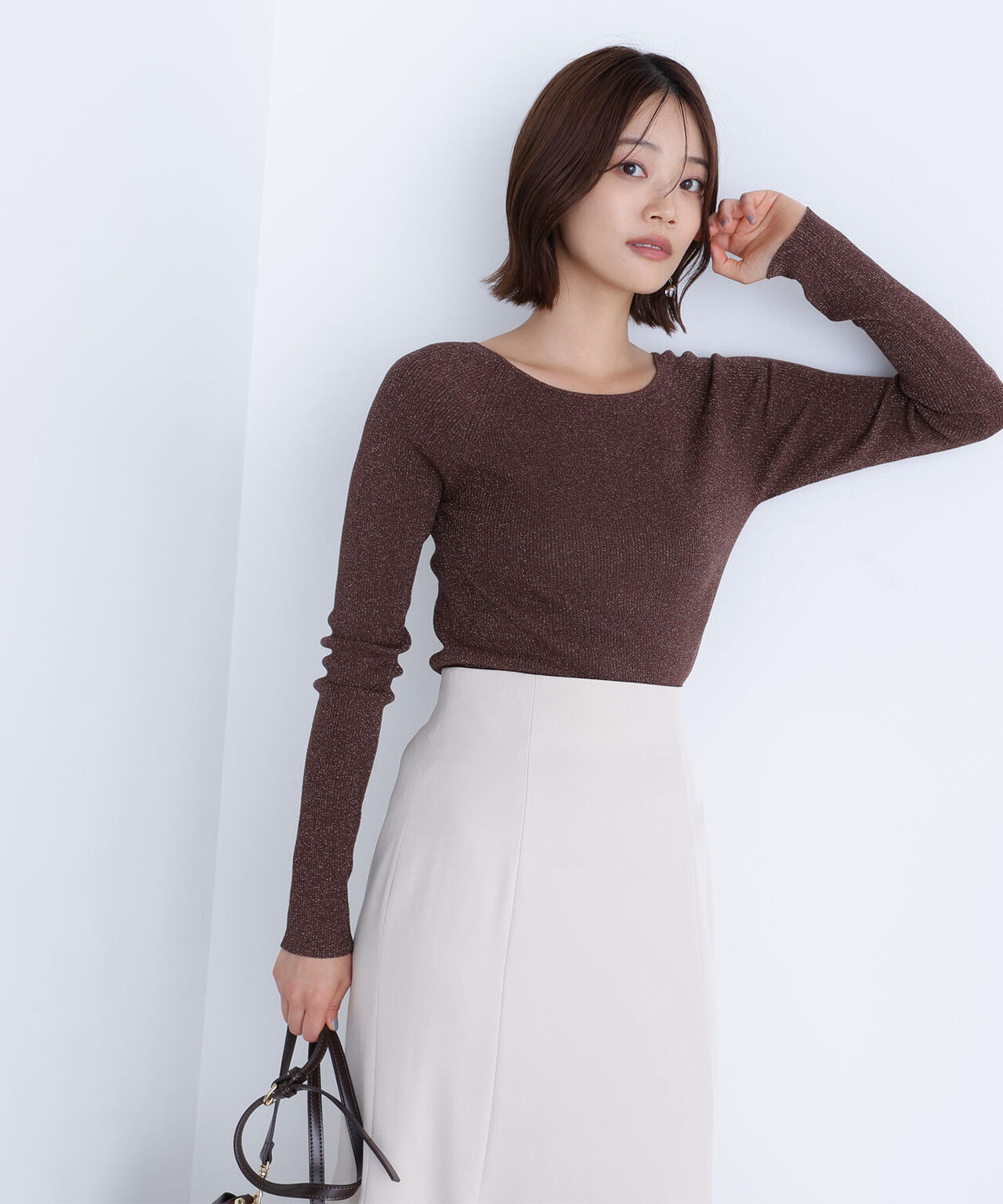 ラメ糸ですっきりとリブ編みに仕上げたニットプルオーバー。ボートネックの襟ぐりはデコルテラインをキレイに見せてくれます。身頃はコンパクトなシルエットで、合わせるボトムスを選ばず着回せるデザイン。ジレやジャンスカなどのレイヤードスタイルのインナーとしてもおすすめです。