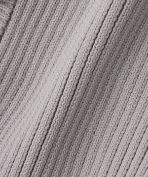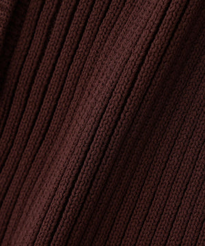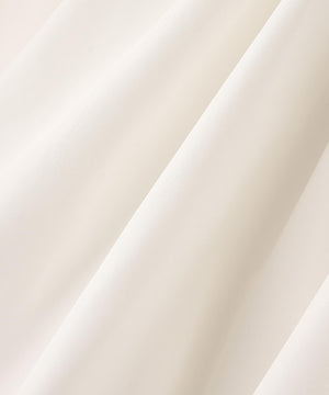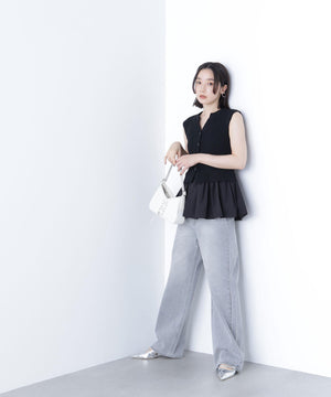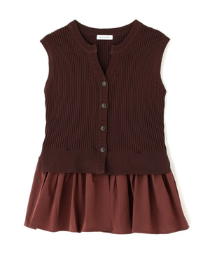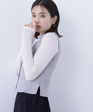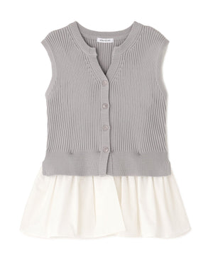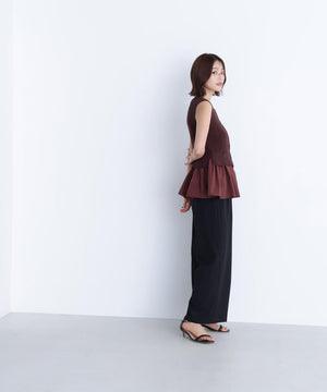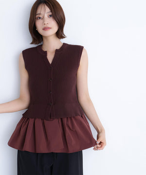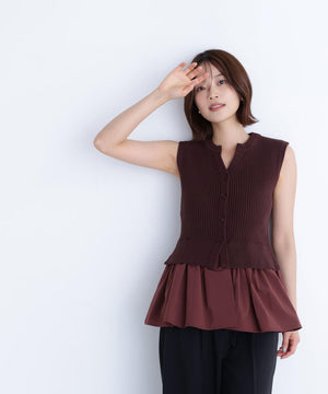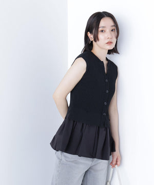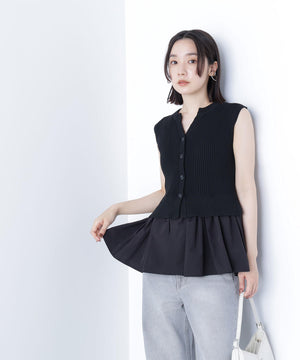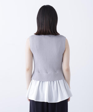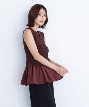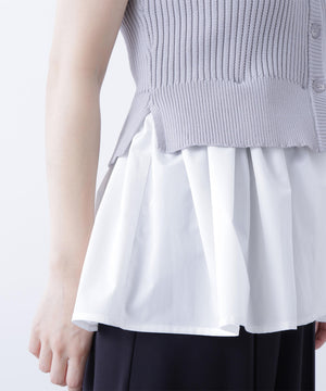 ニットボディ部分は、クリアなタッチのポリエステル糸を使用して、リブ編みですっきりと編み立てています。ペプラムフリル部分は、程よいハリ感のある合繊タフタ素材を使用しています。