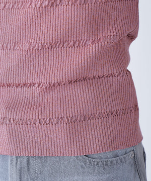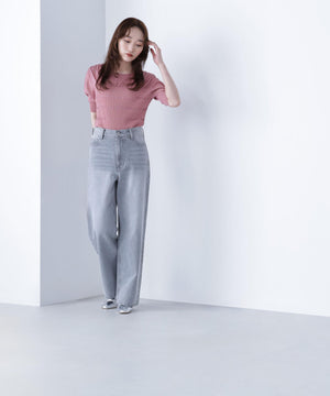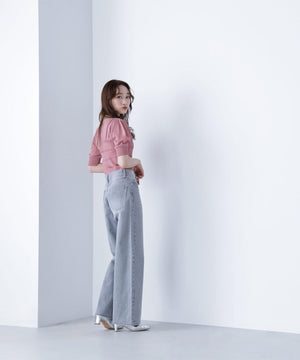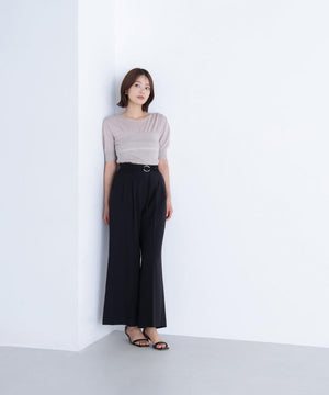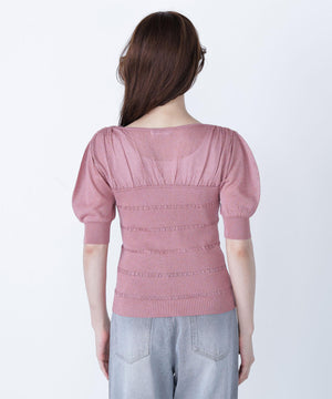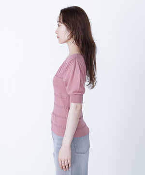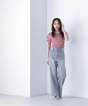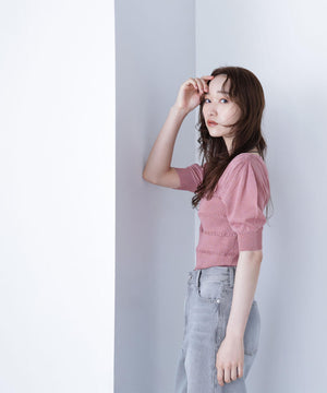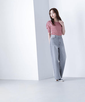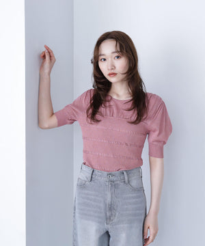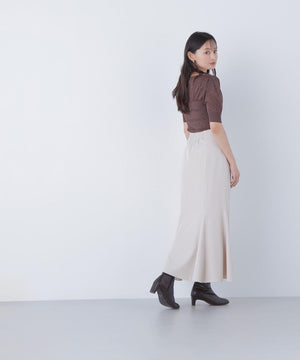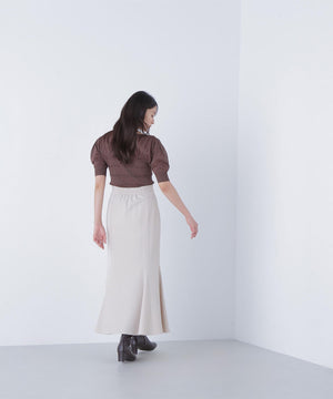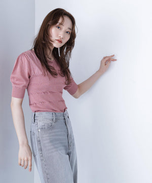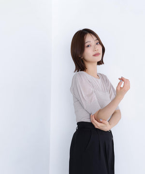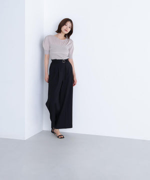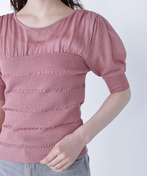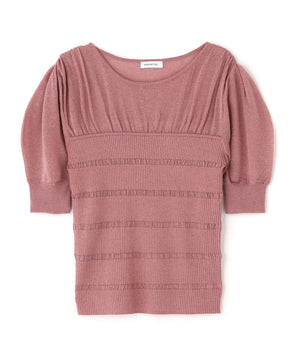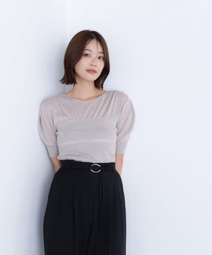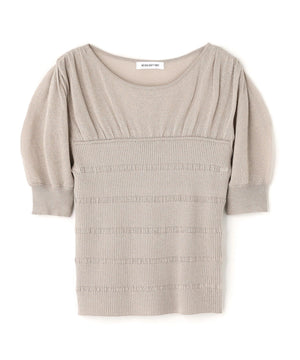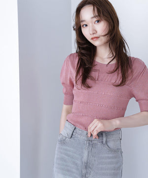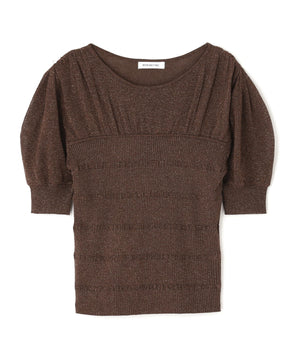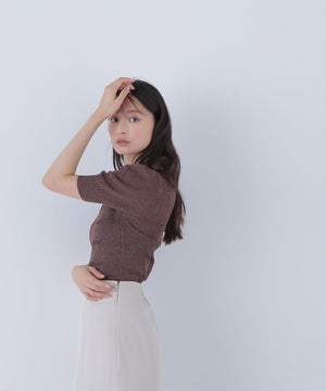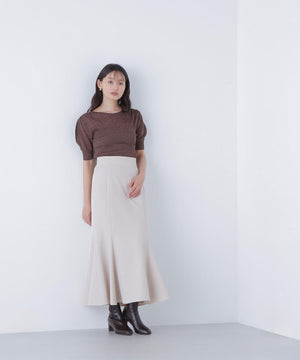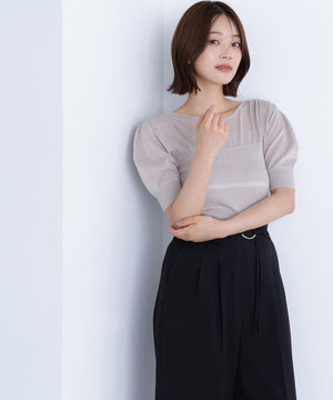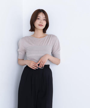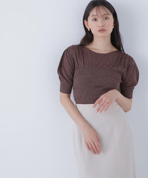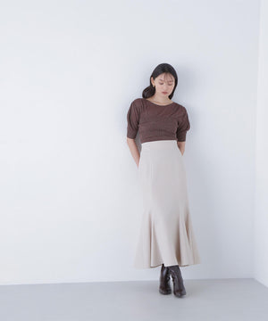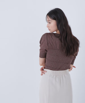 2種類の編地を組み合わせたラメ糸入りのニット。身頃はすっきりとしたサイズ感で、ウエストインもしやすいです。袖はパフスリーブで二の腕をすっきり見えに。パンツにもスカートにも合うので着回しの効くアイテムです。