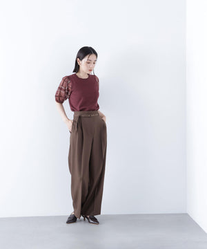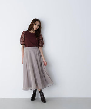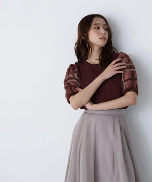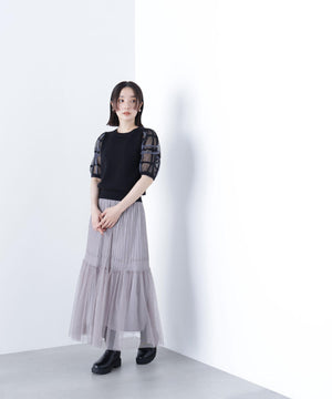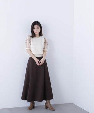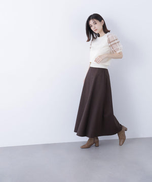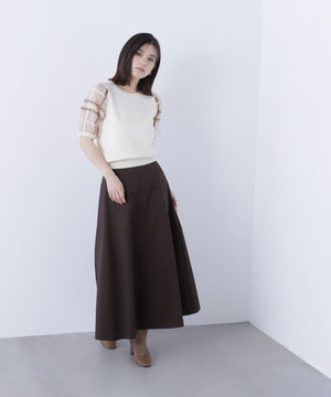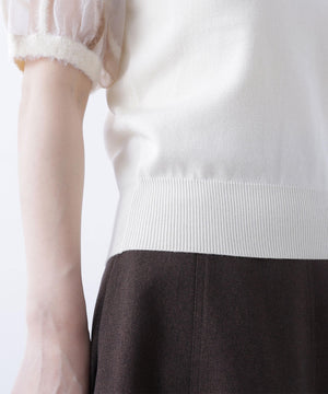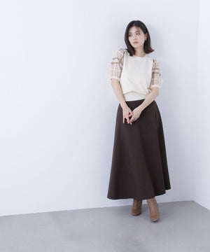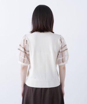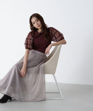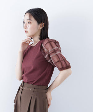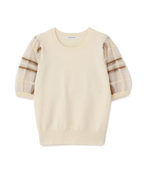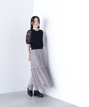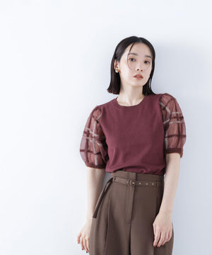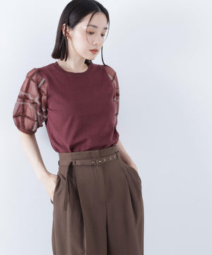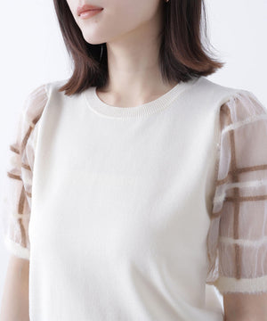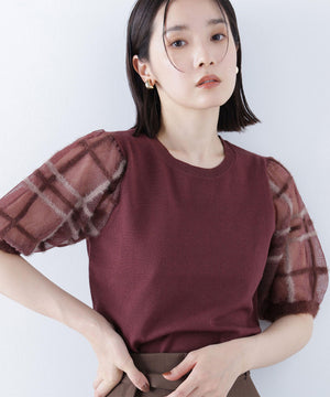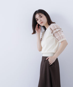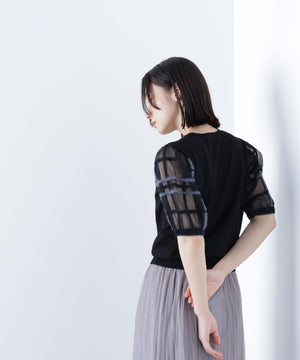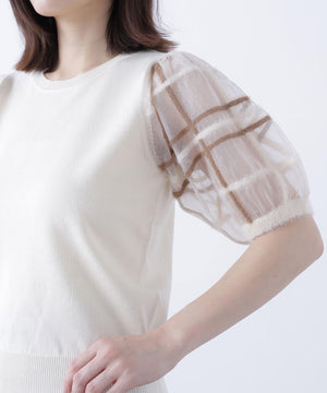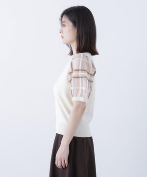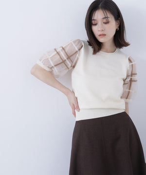 袖に配色とシアーチェック柄を効かせたニット。身頃はすっきりとした天竺編みで、シアーな袖はシャギー糸でチェック柄を組んだ晩夏らしいデザインです。ボリューム感のあるスリーブなので、ONにもOFFスタイルにもフェミニンな雰囲気で着ていただけます。
