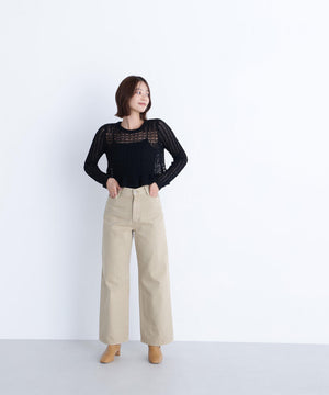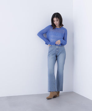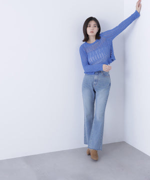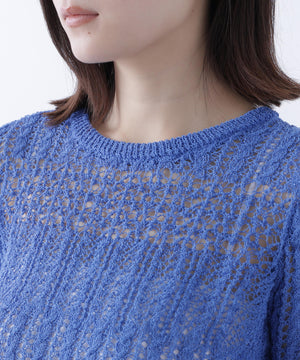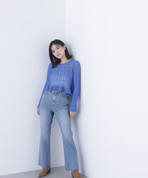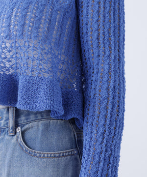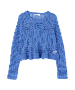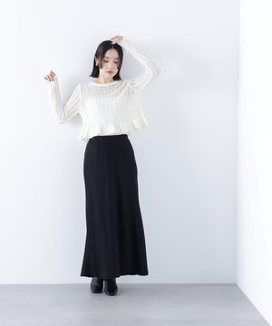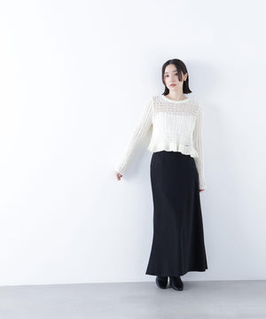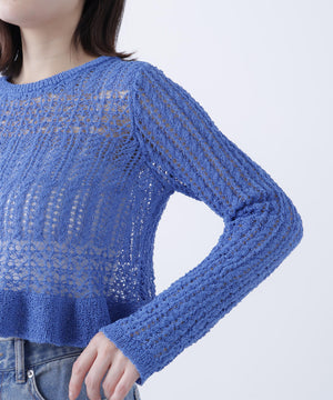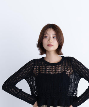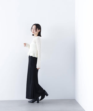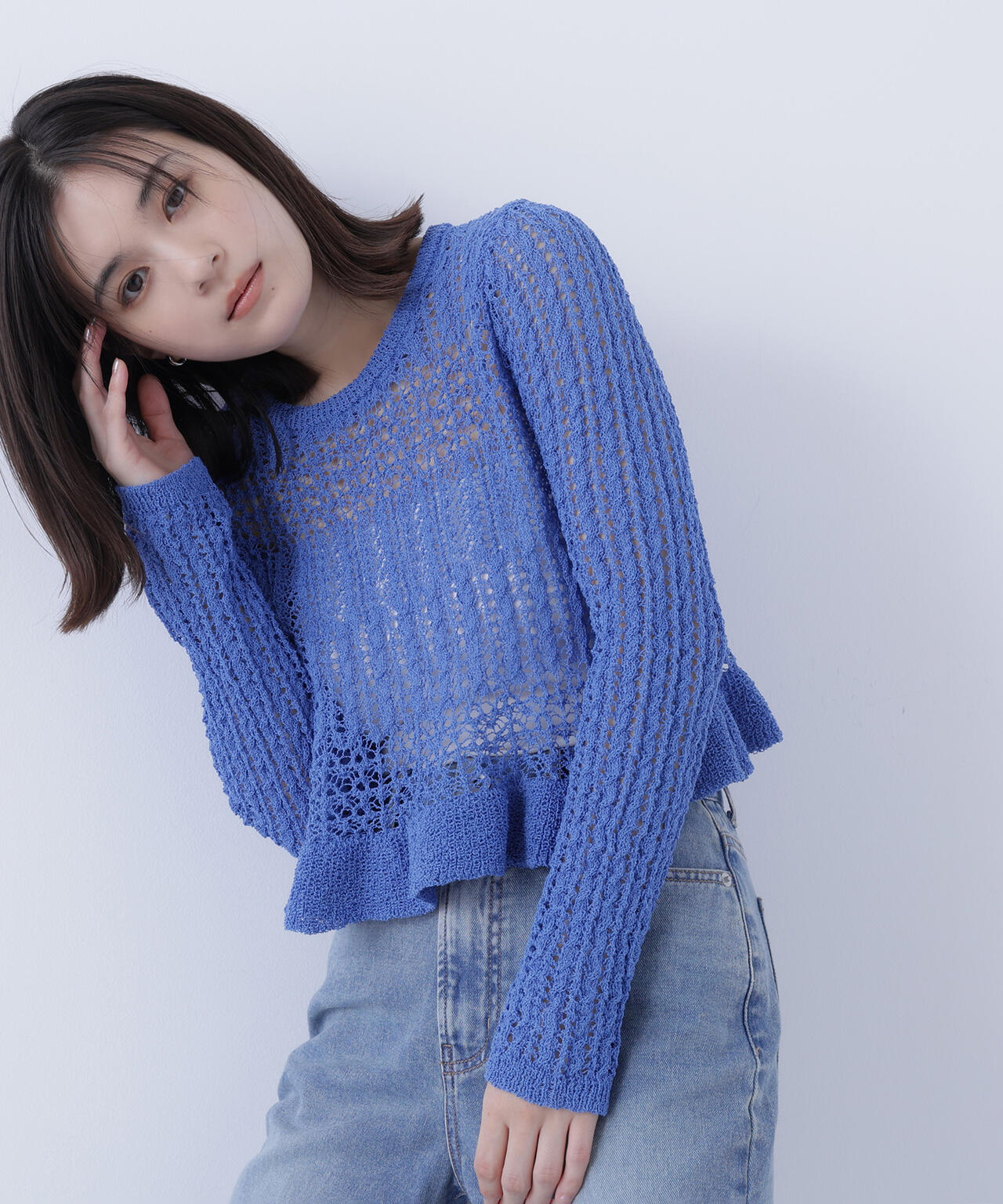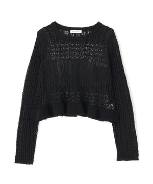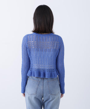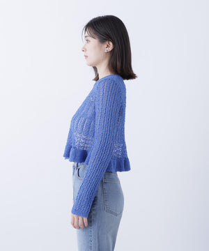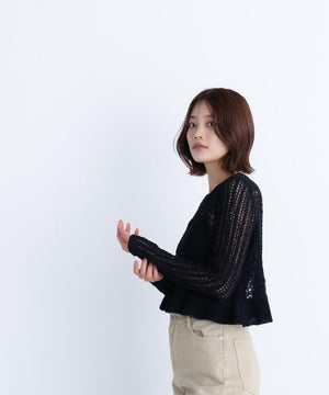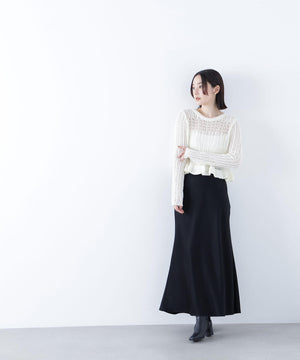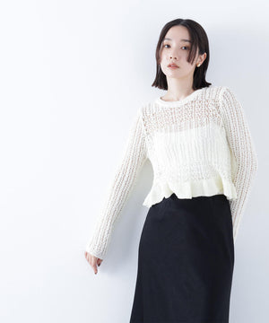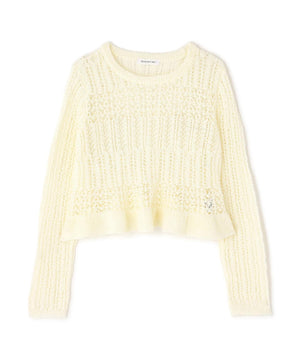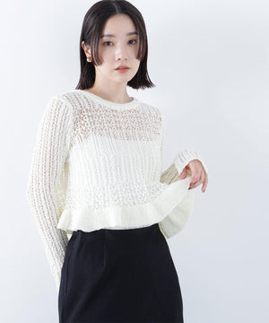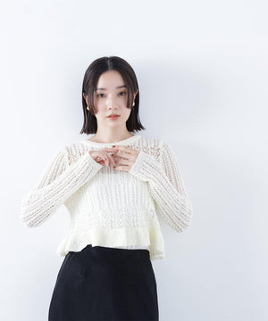 表情のあるブークレーヤーンで編み立てた柄編みニット。繊細なレース柄でカジュアルフェミニンな印象をもちながら、透かし柄で長袖でも軽やかに着ていただけます。今年らしい裾フリルのペプラムシルエットを活かし、デニムと合わせてカジュアルダウンしたり、ナロースカートと合わせてミニマムにすっきりと着こなすなど、様々なスタイリングが楽しめます。