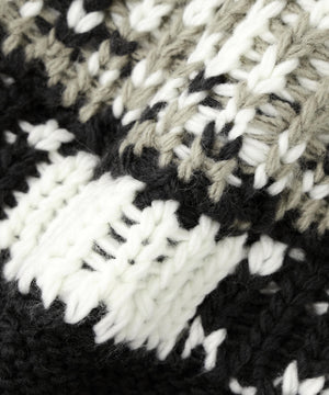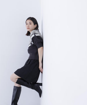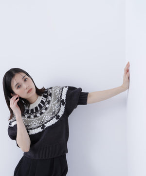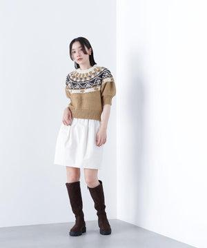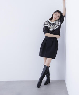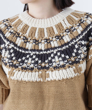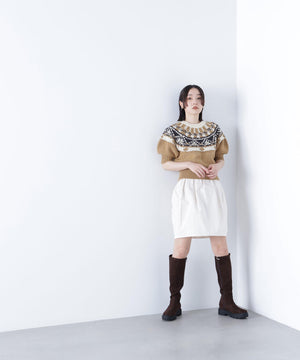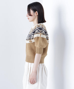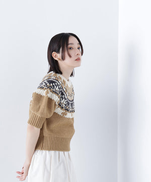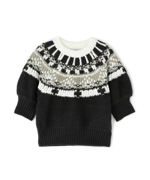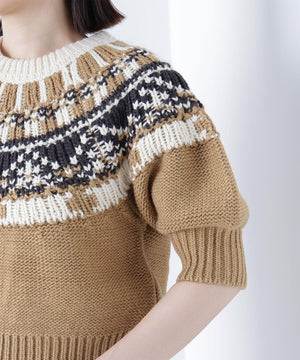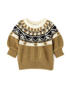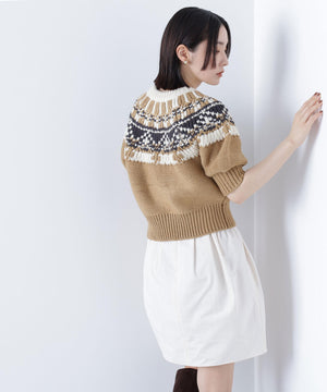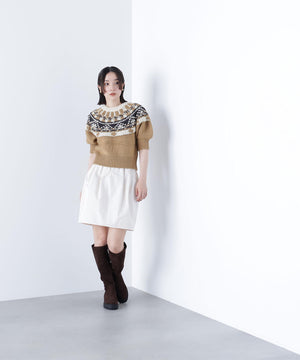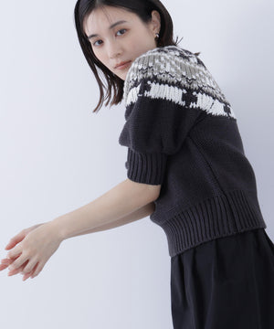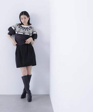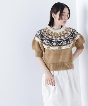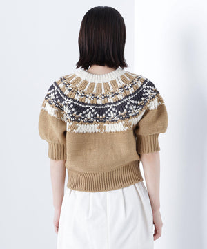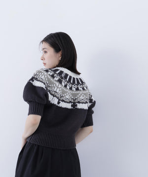 ローゲージでしっかり編み込んだノルディック柄のニット。コンパクトな着丈とフォルムスリーブがレディライクなデザインです。袖は編地で立体的なフォルムシルエットを作り出し、1枚で映えるアイテムです。