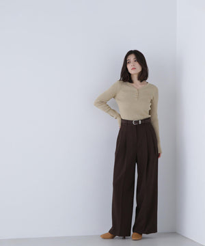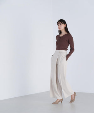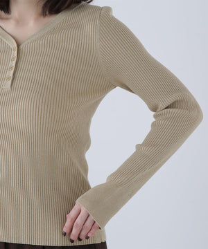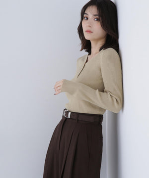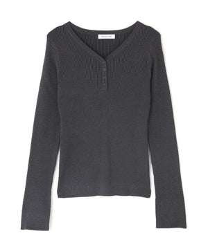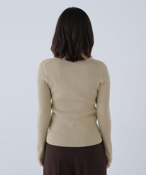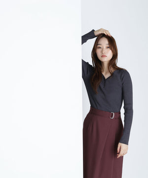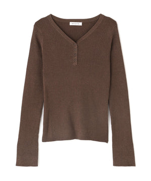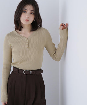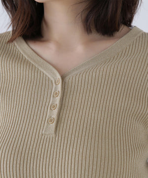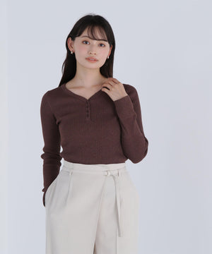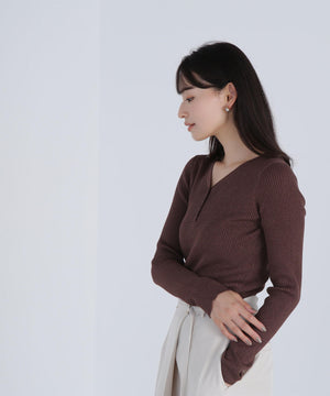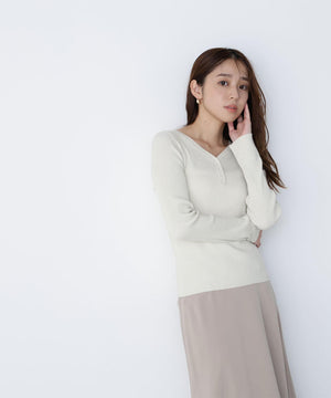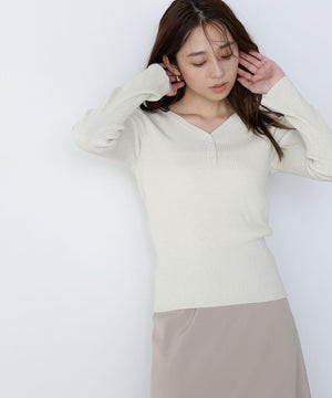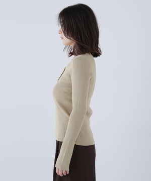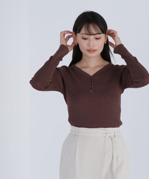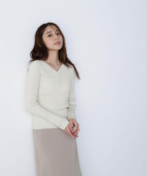 繊細なラメ糸が艶めき、Vネックとアクセントボタンでこなれた抜け感を作るリブニット。すっきりとしたVネックがデコルテを美しく見せ、軽やかな印象です。細めのリブ編みが体に沿い、程よいフィット感ですっきり着られるデザイン。ONにもOFFスタイルにも着回せて、1枚で様になる汎用性の高さも魅力です。