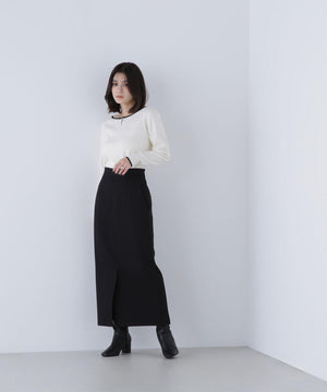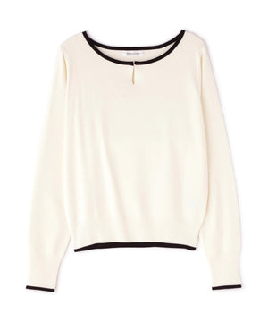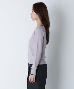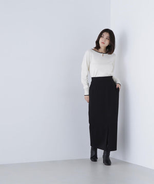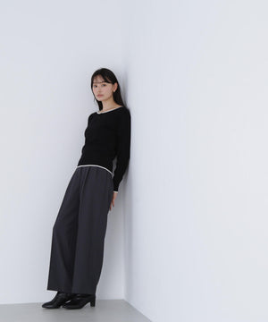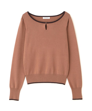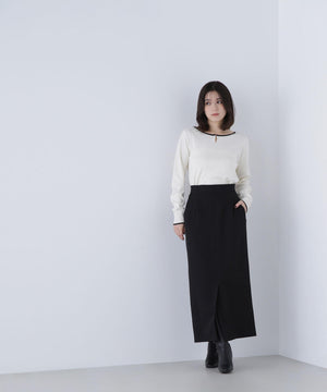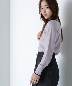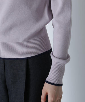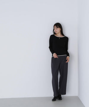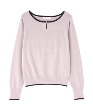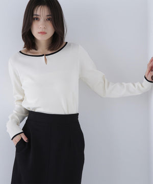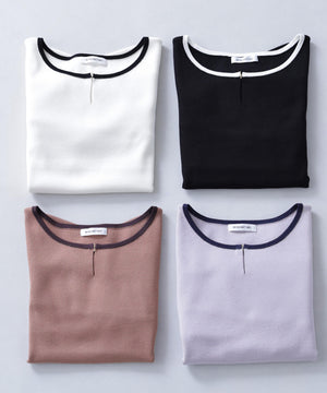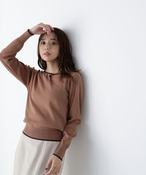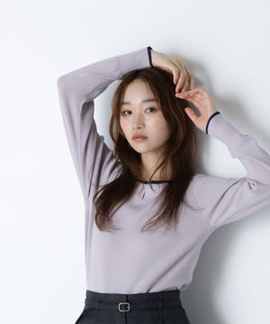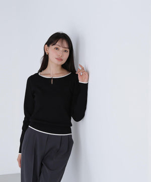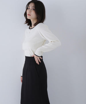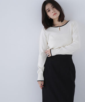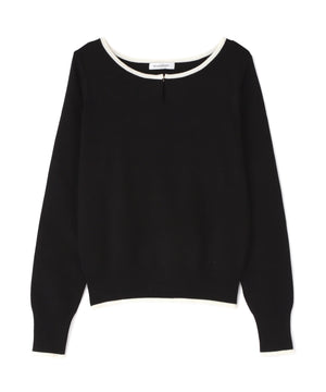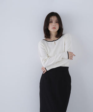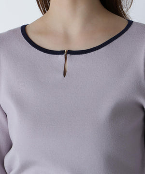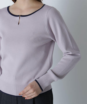 襟ぐりのTバーメタルホックをアクセントに効かせた、キレイめニットプルオーバー。襟と袖口に華奢なバイカラーデザインを入れて、ジャケットなどのアウターインにも着やすいように、すっきりとした袖に仕上げました。デイリーからオフィスシーンまで幅広く着ていただけます。※フロントのホックを開けずに被りで着脱できます。