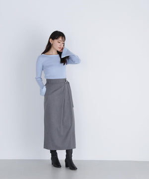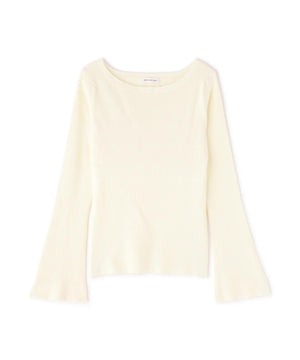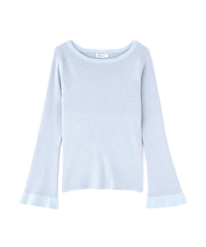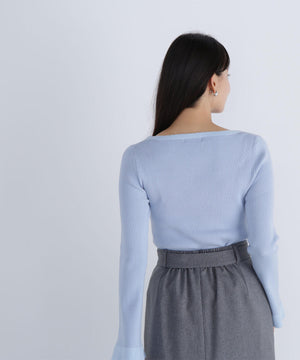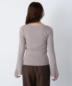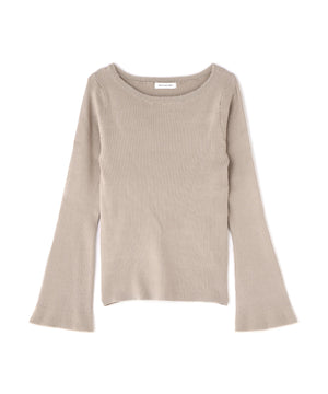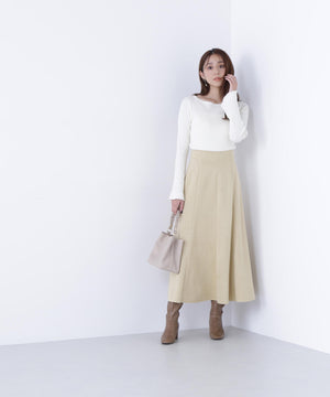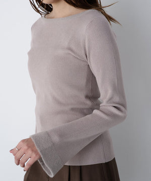 襟ぐりと袖口にシャギーをトリミングしたフェミニンな雰囲気のニットプルオーバー。袖は女性らしいフレアスリーブで、襟はデコルテラインをキレイに見せてくれるボートネックデザインです。ニットと同色でトリミングしたシャギーのデザインが、女性らしい雰囲気を引き立てます。身頃はリブ編みですっきりと編み立てているため、ジャンスカやジャケットのインナーにもおすすめです。