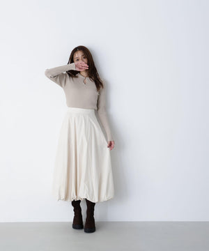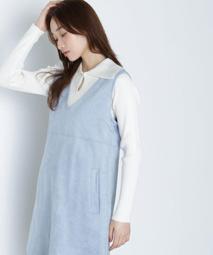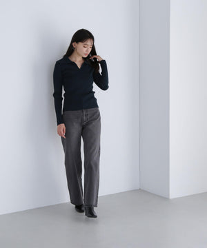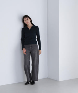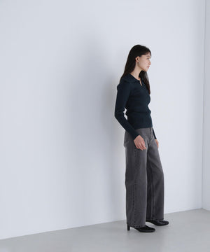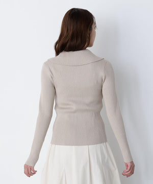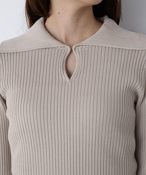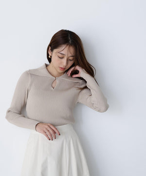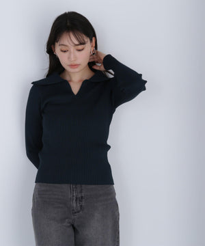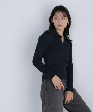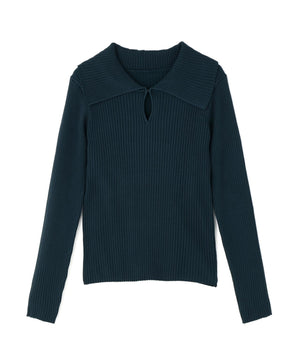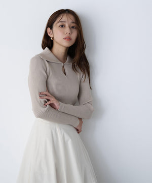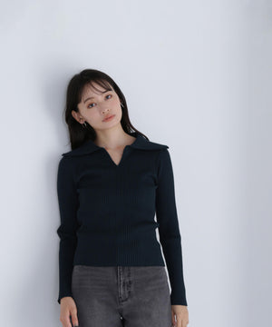 トレンドの襟付きデザインのリブニットプルオーバー。身頃はリブ編みでコンパクトなサイズ感にし、体のラインをすっきりと見せてくれます。大きめの襟が1枚着でも映えるので、スタイリングのアクセントにぴったり。フロントのホックを開けると抜け感のあるスキッパー襟としても着ていただけます。