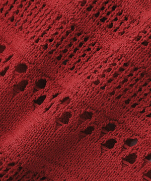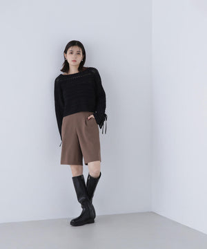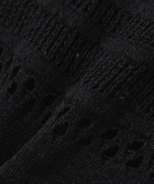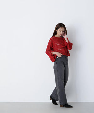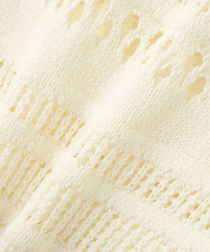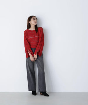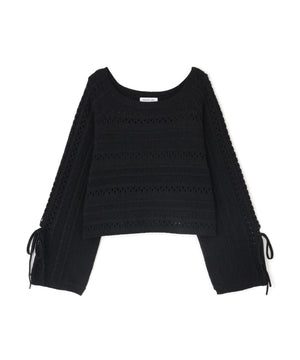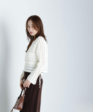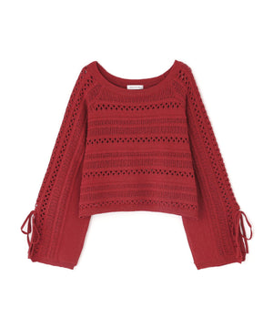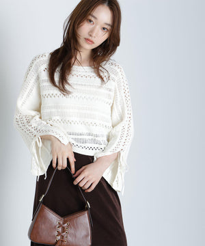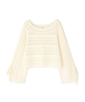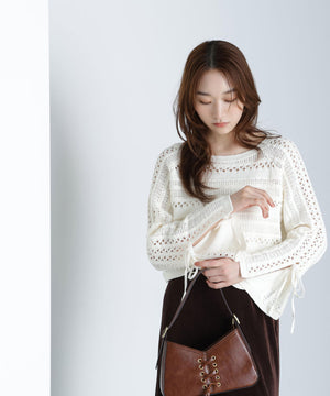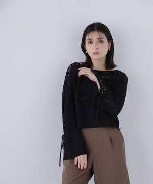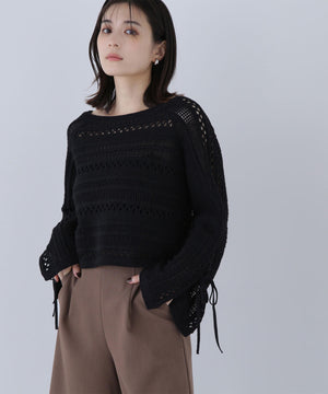 ふくらみのある糸を使用した秋にぴったりな透かし編みニット。袖口のリボンをアクセントに、スリットも入っているので動きのあるシルエットを叶えます。中にタンクトップやシアーインナーを合わせるなど、様々なレイヤードが楽しめる素材です。カジュアルな雰囲気なので、スラックスやバルーンスカートと合わせるのがおすすめです。