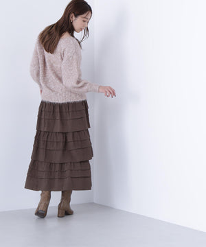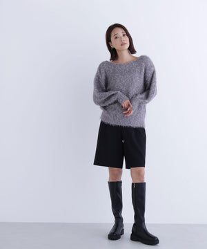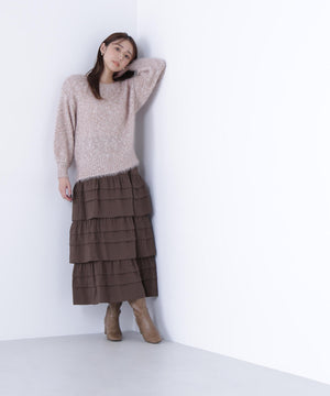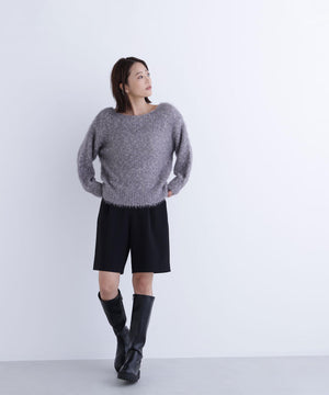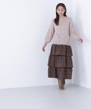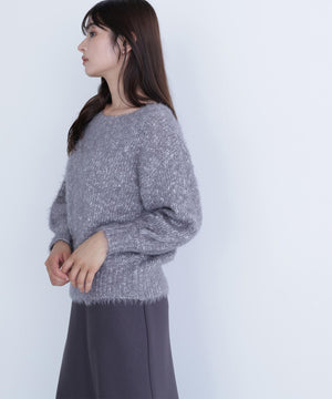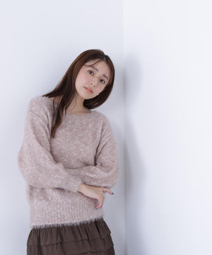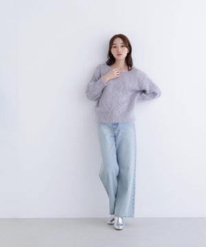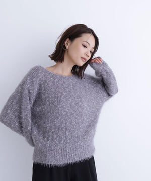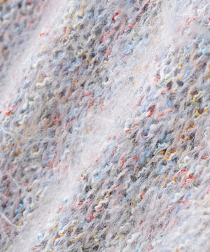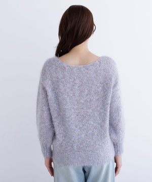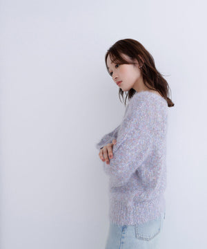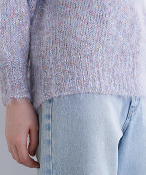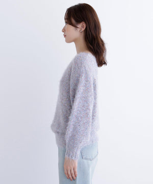 猫毛のようなフィルムシャギー糸とカラフルで凹凸感のあるファンシーヤーンを引き揃えたニットです。