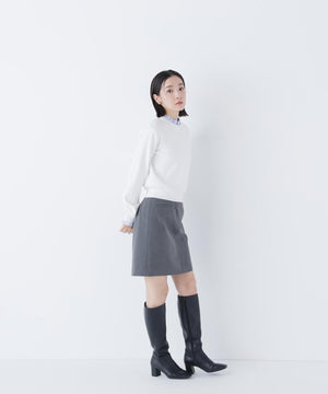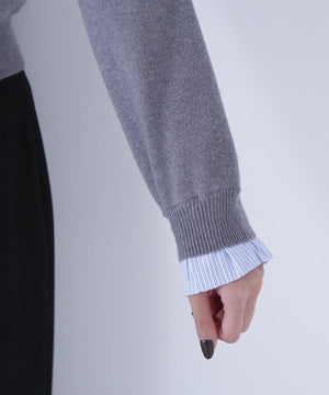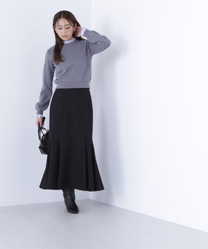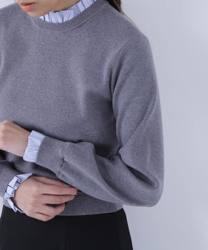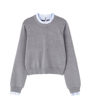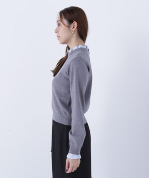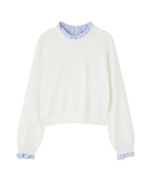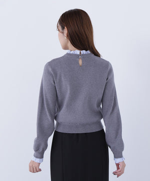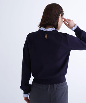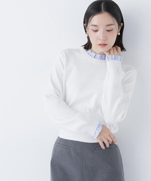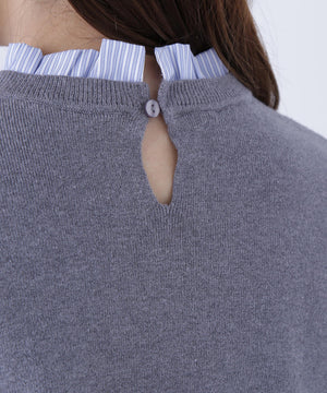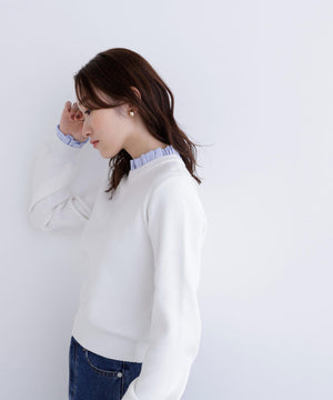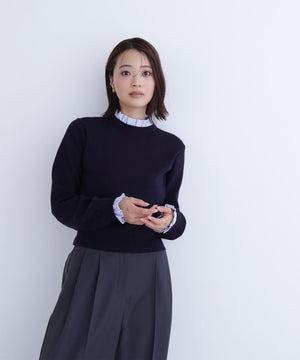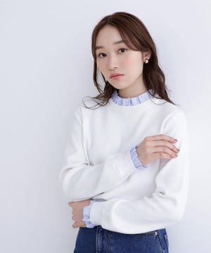 襟ぐりと袖口にドッキングしたストライプ素材のフリルがポイントのニットプルオーバー。1枚着るだけでシャツをレイヤードしているようなデザインです。ニットに対して、襟ぐりと袖口のストライプフリルを配色にしてポイントに。身頃はすっきりとした総針編みのため、普段着とオフィスシーンの両方で着回せます。