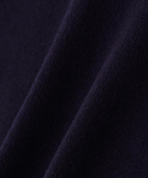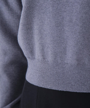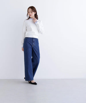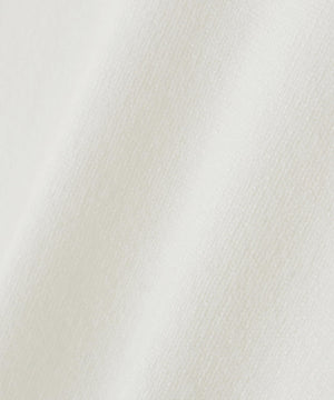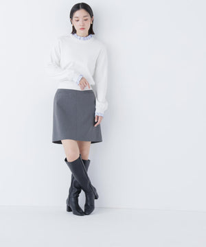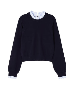 ボディのニットはキレイな目面の糸を使用し、総針編みで編み立てています。襟ぐりと袖口のフリル部分はストライプ柄のブロード素材を使用しています。
