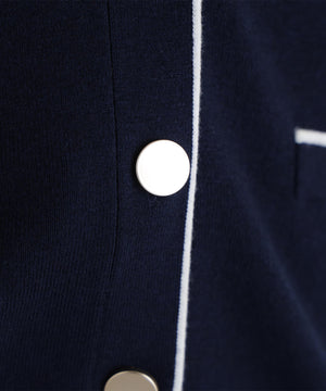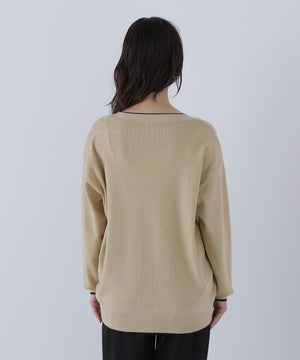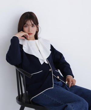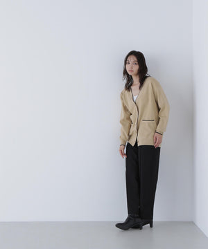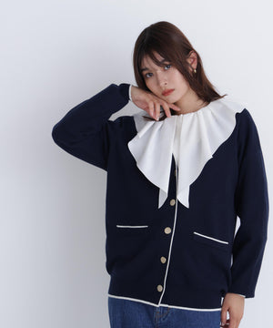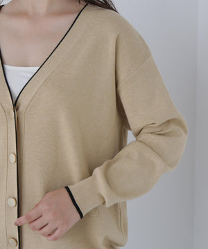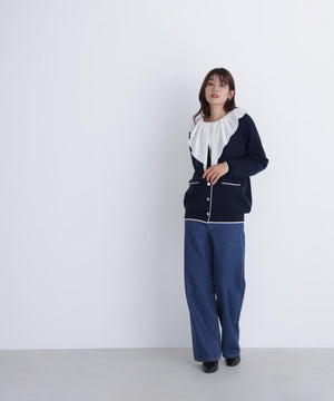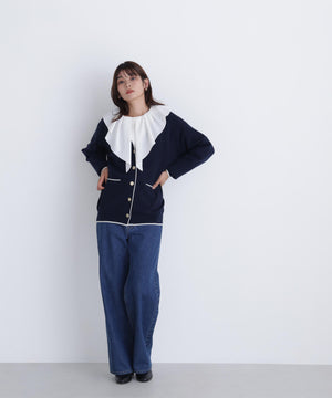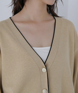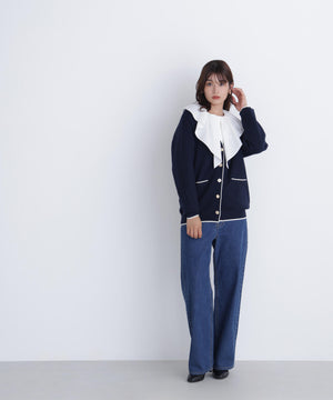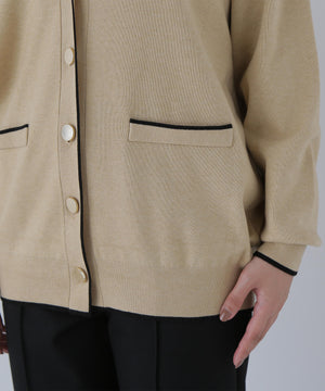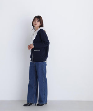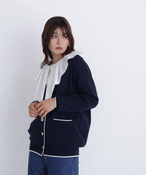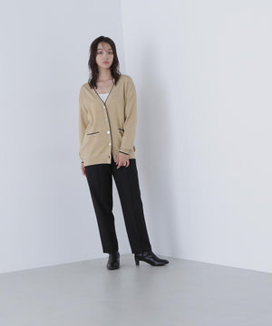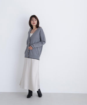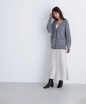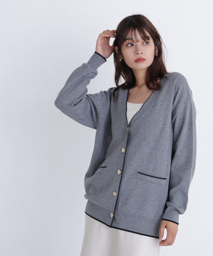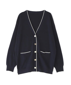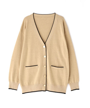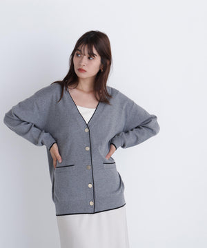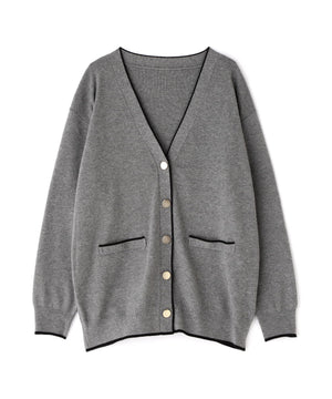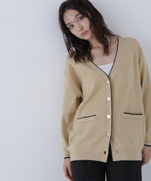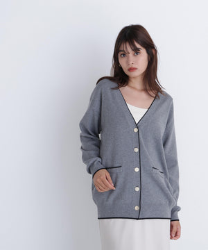 ミドル丈のボクシーシルエットが今の気分にぴったりなカーディガン。バイカラーラインがさりげないアクセントになり、上品な印象に見せてくれます。ゴールドカラーのボタンがポイントで、ベーシックながら存在感のあるデザイン。ゆったりとした着心地なのでデイリーからキレイめスタイルまで幅広く活躍します。