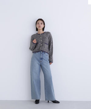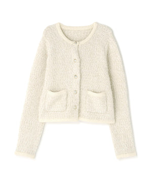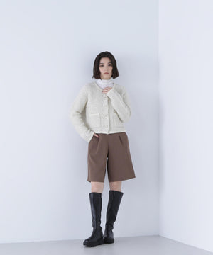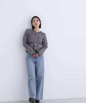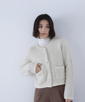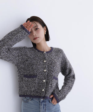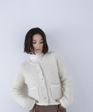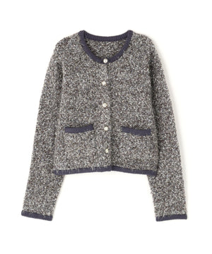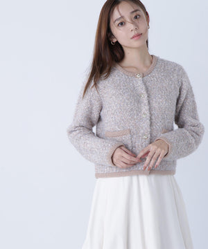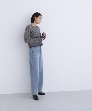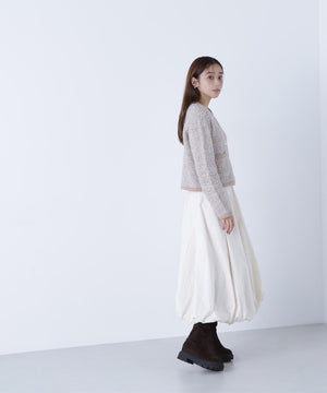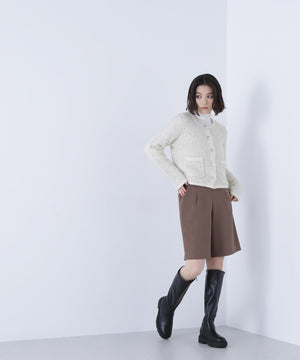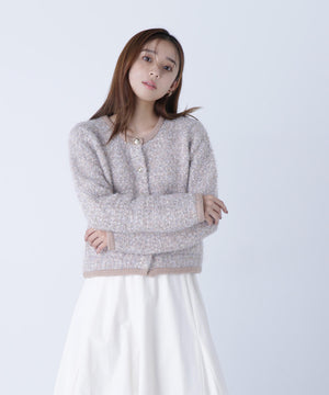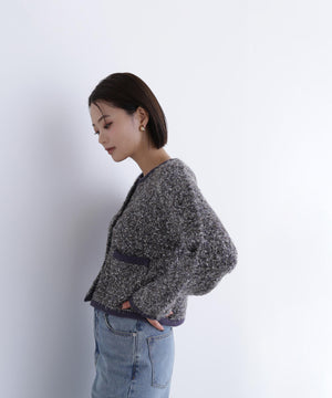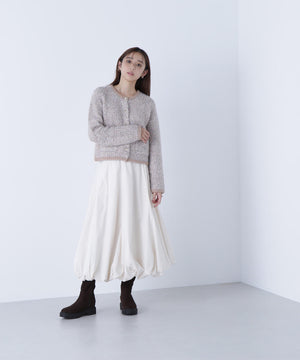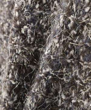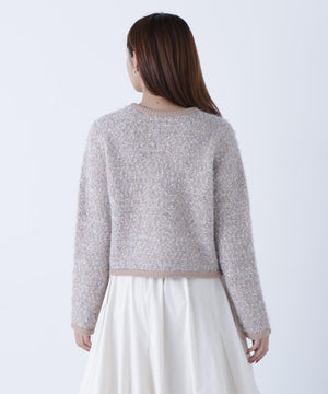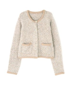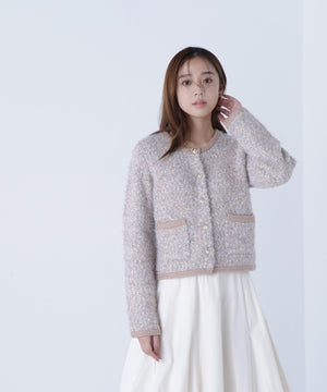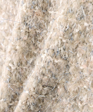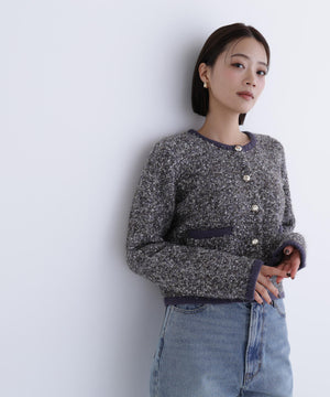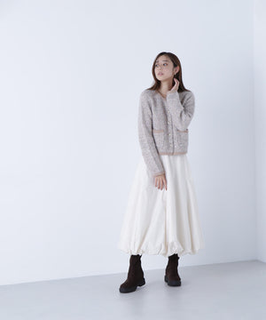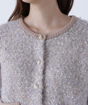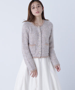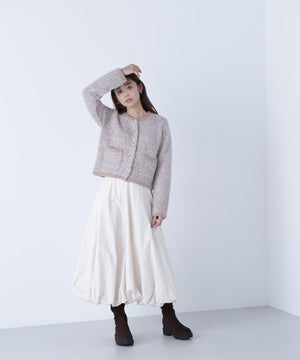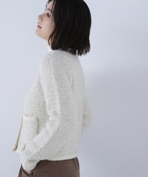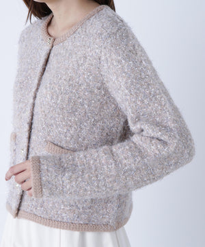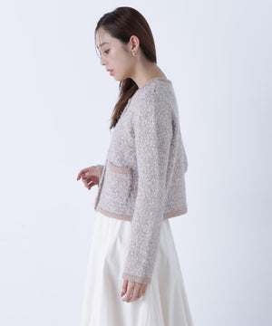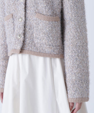 上品なラメ糸が煌めくツイード調のニットを使用。立体感と華やかさを兼ね備えた素材です。