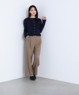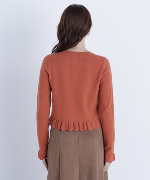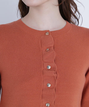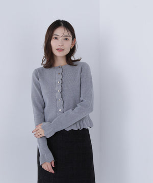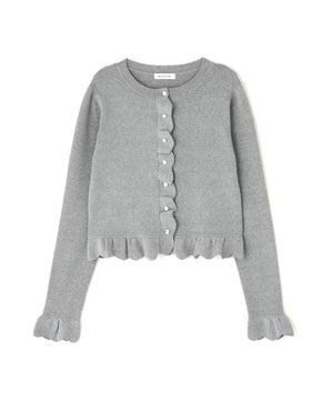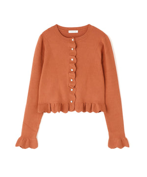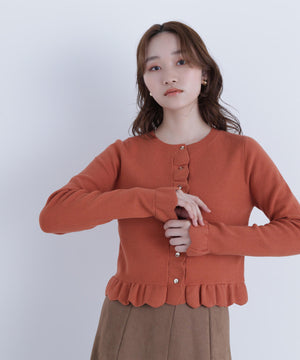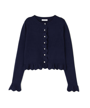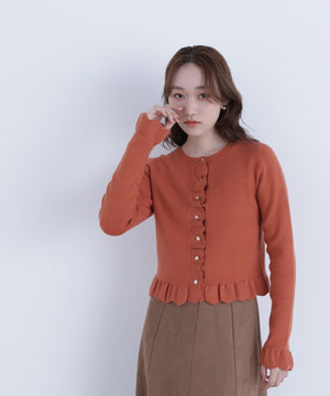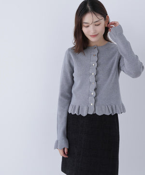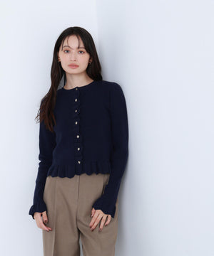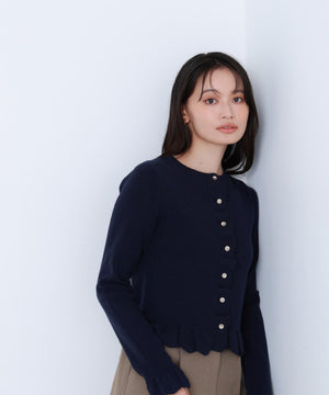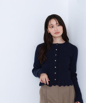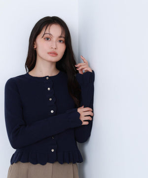 今季トレンドのスカラップ状にあしらったフリルが目を引くニットカーディガン。前立て、袖口、裾に入れたフリルデザインが、スタイリングを華やかに見せてくれます。フロントのゴールドカラー釦が上品なアクセント。前ボタンを留めてトップス風に着こなすのもおすすめです。オフィスシーンはもちろん、休日のお出かけにも取り入れやすいデザインです。