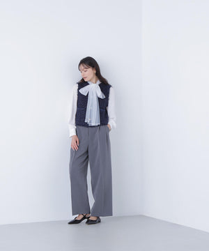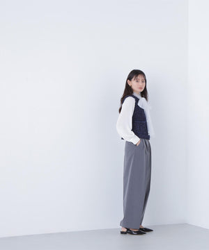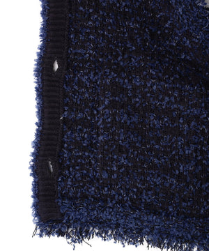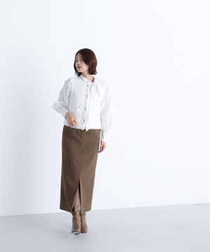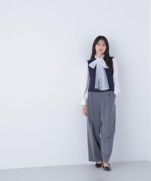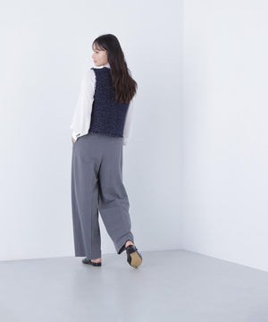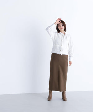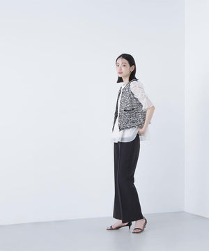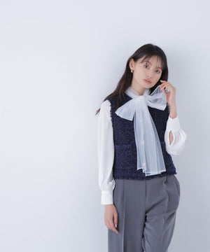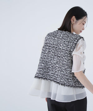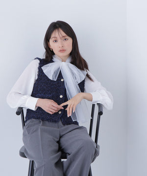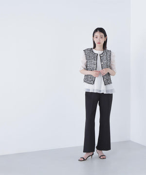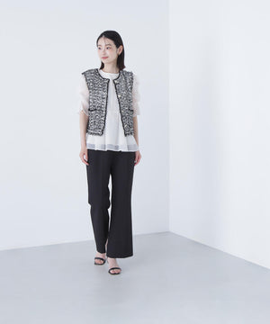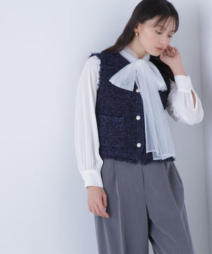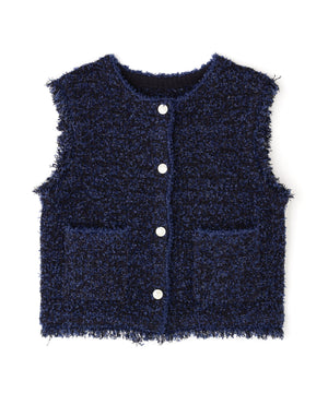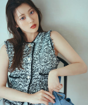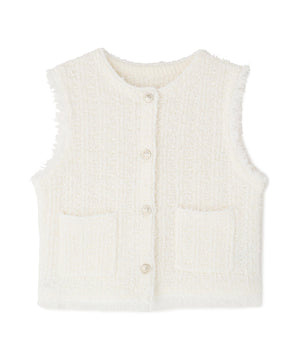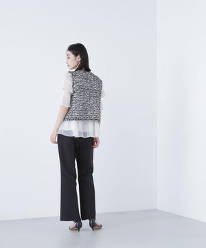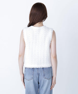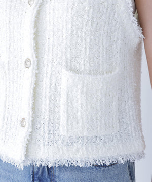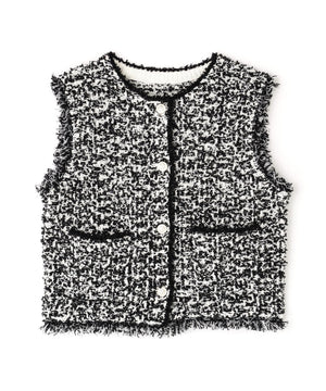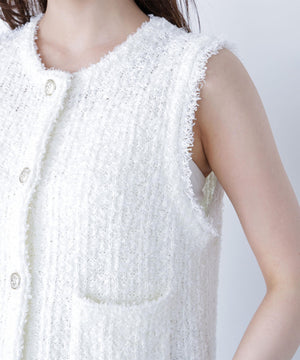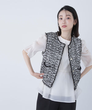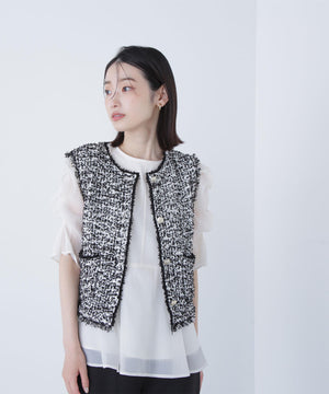 ニットでツイード柄を表現した、特別感のあるニットジレ。ゴールドカラー釦が上品なアクセントになります。襟ぐり、袖口、裾にフリンジを施して華やかさを演出。レイヤード次第でコーディネートの雰囲気を変えながら、ロングシーズン着ていただけます。