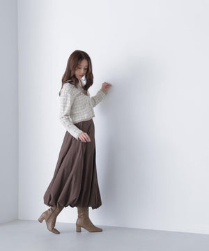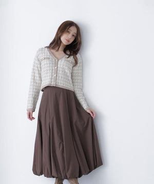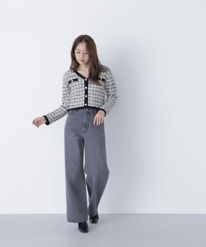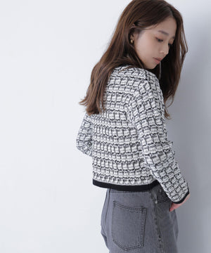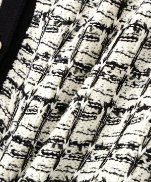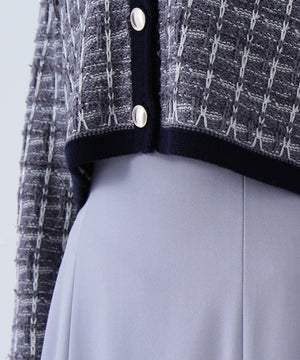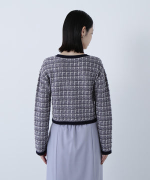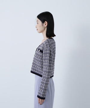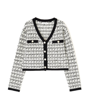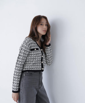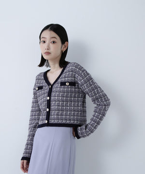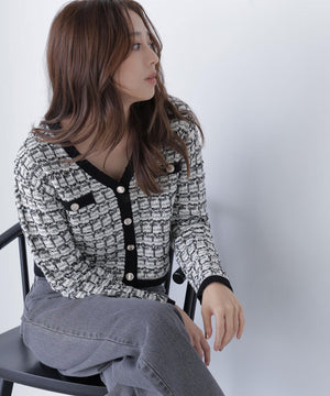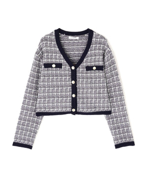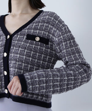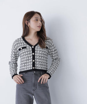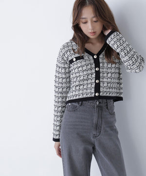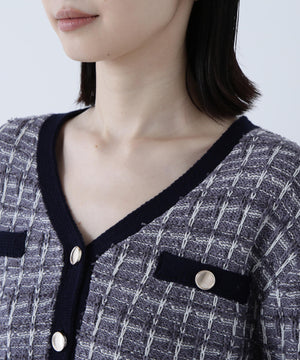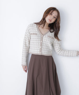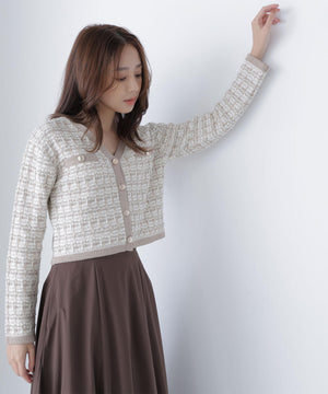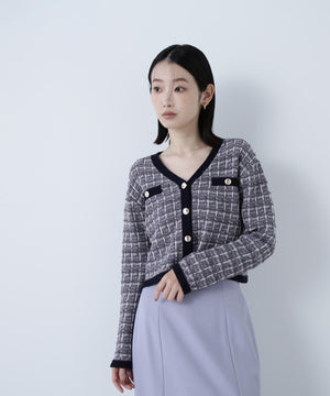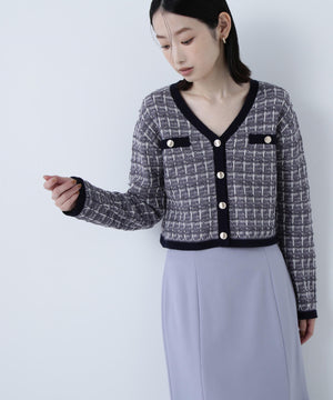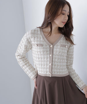 ツイードライクに編み立てた立体感のあるVネック開きニットカーディガン。複数のファンシーヤーンとラメ糸を組み合わせることで、程よい光沢感と表情のある表面感がポイントです。スカートでもパンツでもバランスが取りやすいショート丈もポイント。ボクシーシルエットなのブラウスとの重ね着にもワンピースの羽織りにも着回せます。