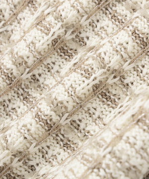くるくるとしたブークレー糸やフラッグヤーン、ラメ糸をなどを組み合わせて、ツイード編みに編みたてています。