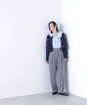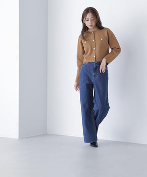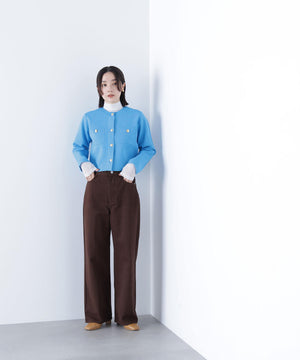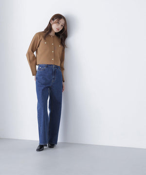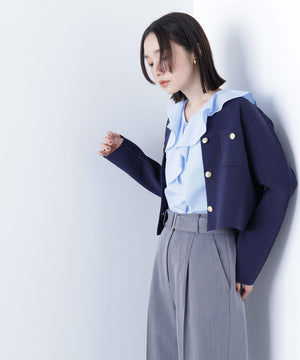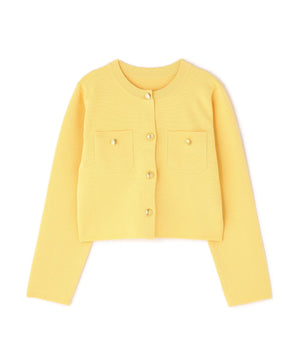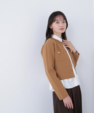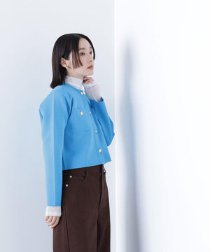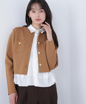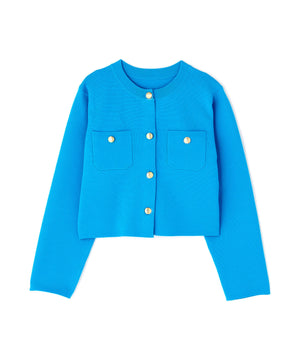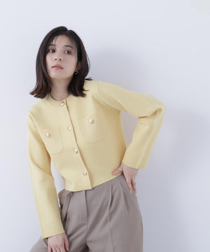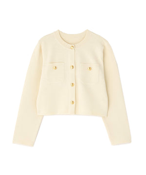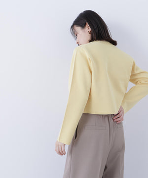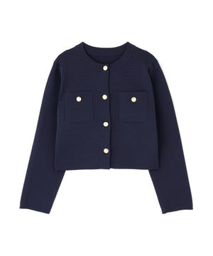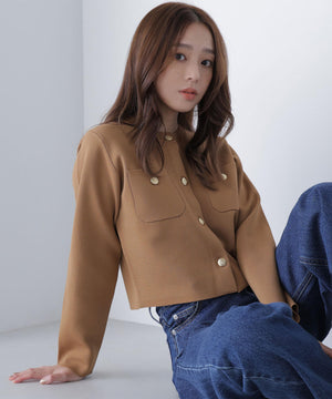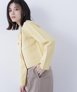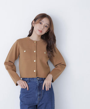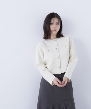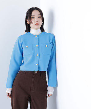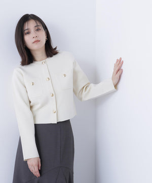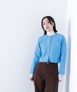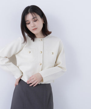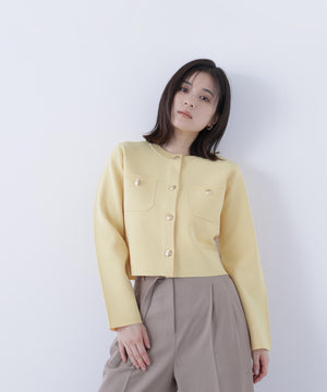 エンブレムのゴールドカラー釦が目を惹くニットジャケット。カーディガンとジャケットの中間役のように着られるシンプルなデザインです。詰まったクルーネックできちんと感のある印象にし、一枚でサマになるよう調整した身幅と長すぎない着丈です。伸縮性のある糸を使用しているのでストレスフリーな着心地も魅力。
