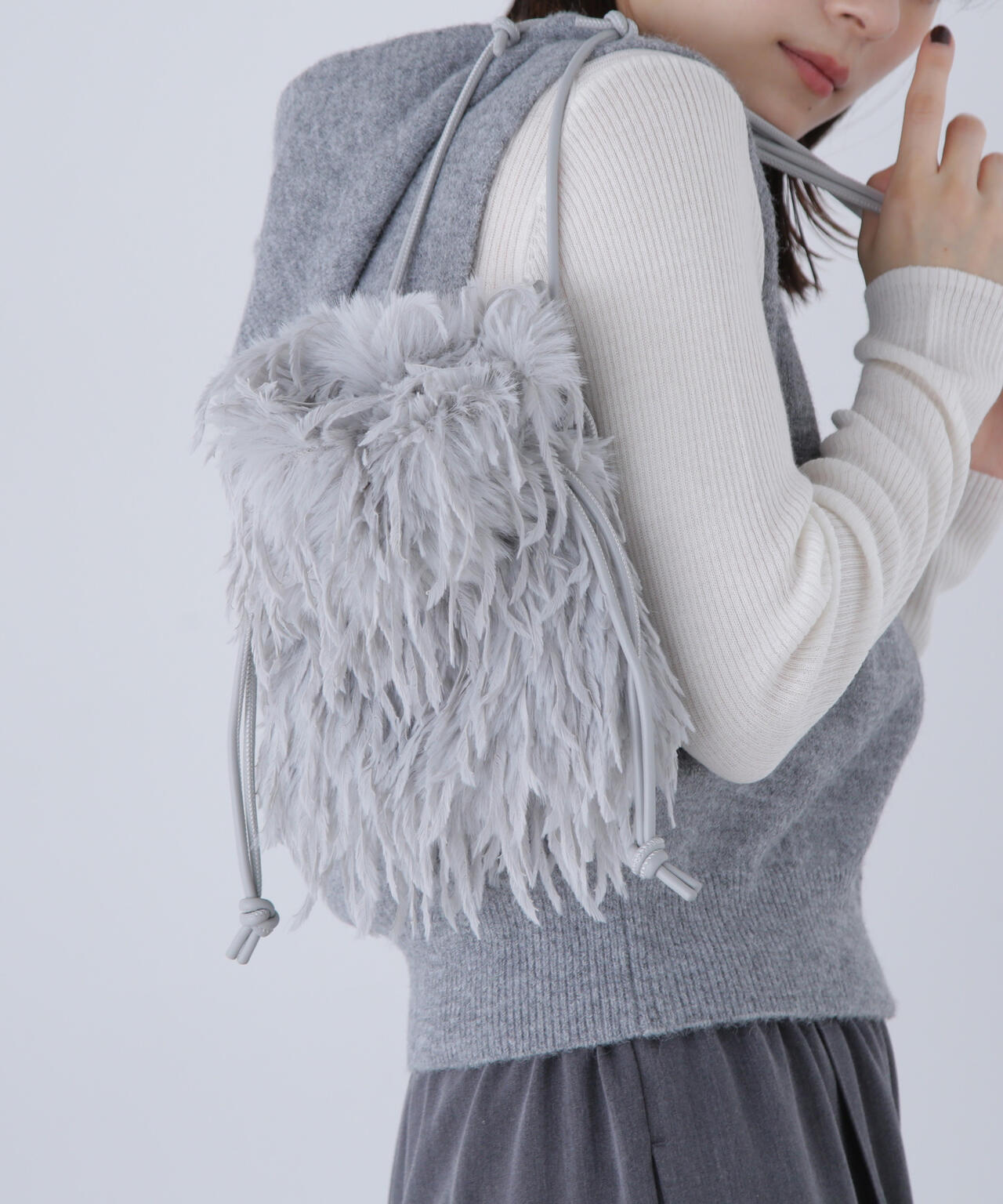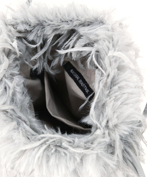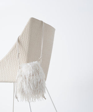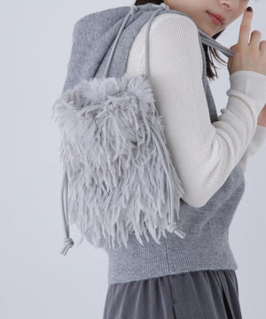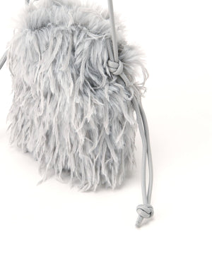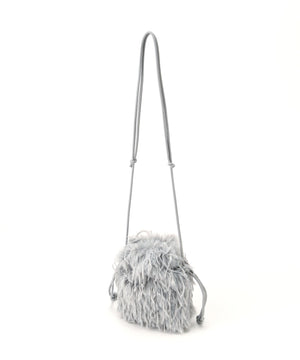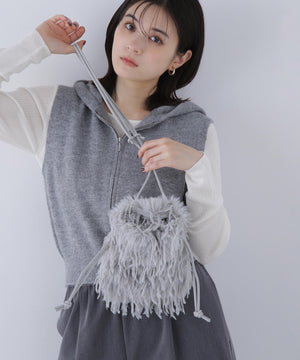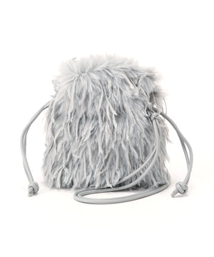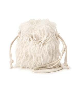フェザー調のフェイクファーがキャッチーなミニバッグ。開口部はドローストリングで開き、ショルダーストラップはフリーアジャスト仕様になっています。スマートフォンが縦に収まるサイズ感で、デイリーからパーティーシーンまで使えるデザインです。