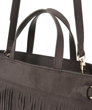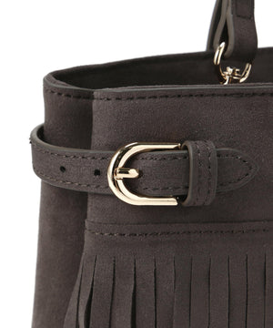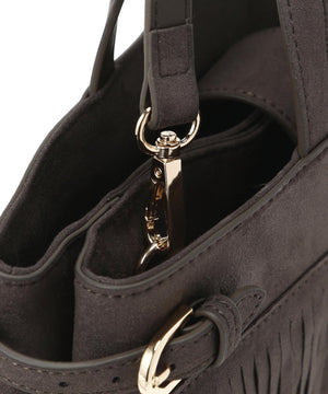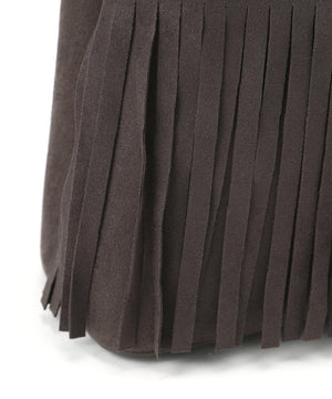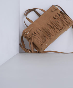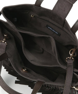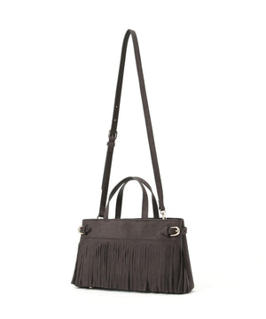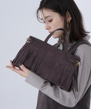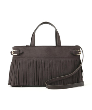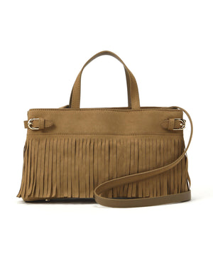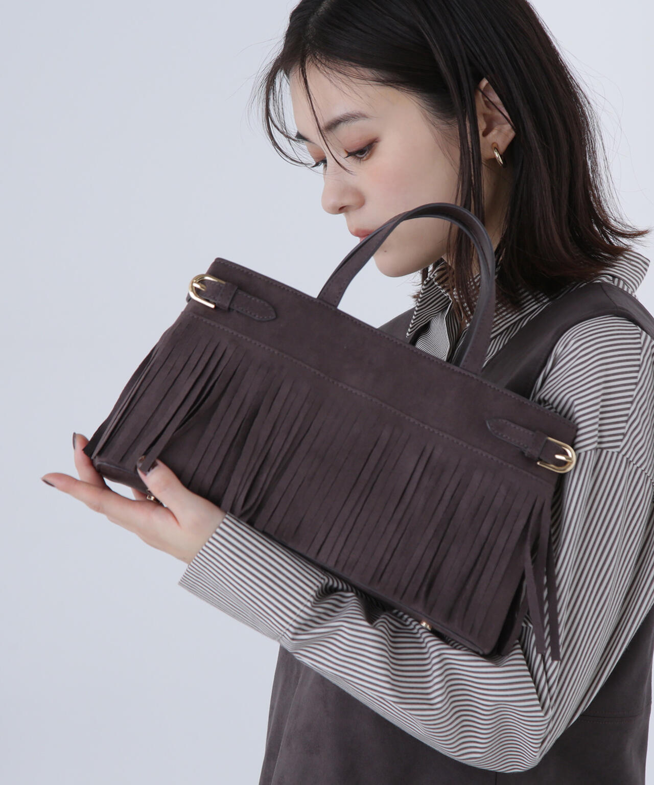 フェイクスウェードのフリンジが映える今季トレンドのウエスタンムード漂うバッグです。中は3部屋に分かれた作りで、荷物を仕分けしながら収納するのに便利です。ショルダーストラップが付属しているので、クロスボディ持ちも出来ます。