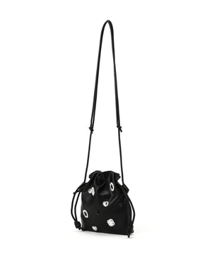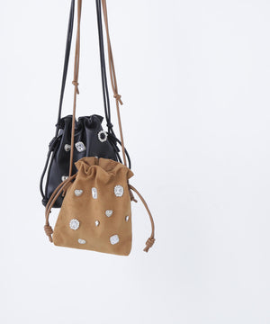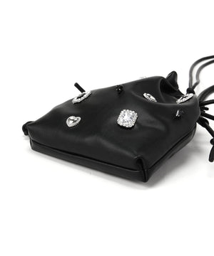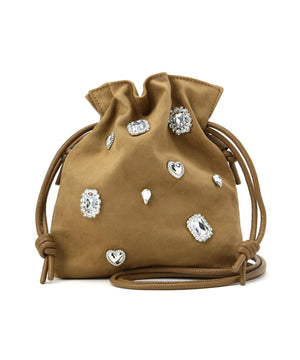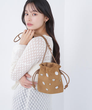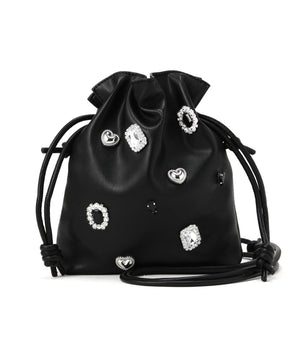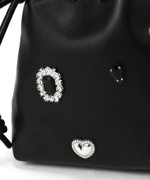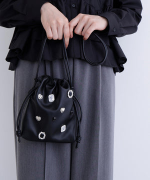 様々なモチーフパーツがついた、ビジュー感覚のドロストポシェットです。コンパクトながらスマートフォンが縦に収納できるサイズ感です。ショルダーストラップはスライド式で長さ調節が可能、お好みの長さにアレンジできます。
